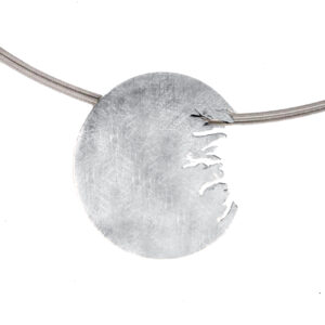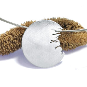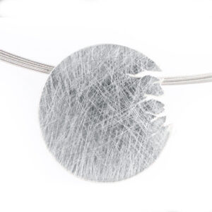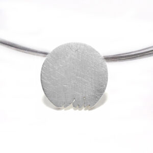 Penjoll de plata, d'uns 3.1 cm. de diàmetre, en forma de rodona amb mosegada. Acabat mate ratllat o polit. Cordó no inclós.
