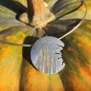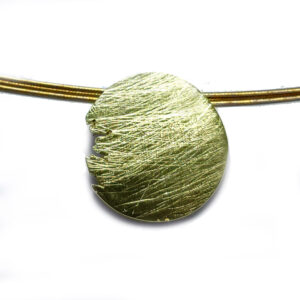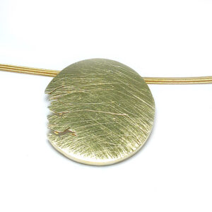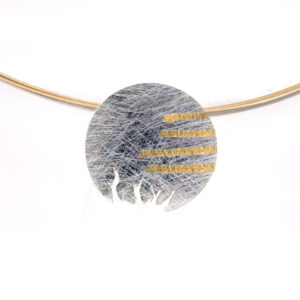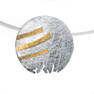 Penjoll de plata i or de 24k, d'uns 3.1 cm. de diàmetre, en forma de rodona amb mosegada i 2 lineas d'or Kumm Boo. Acabat mate ratllat o polit. ...