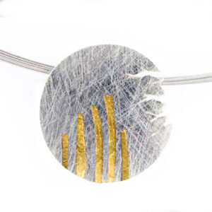 Penjoll de plata i or de 24k, d'uns 2.1 cm. de diàmetre, en forma de rodona amb mosegada i 2 lineas d'or Kumm Boo. Acabat mate ratllat o polit. ...