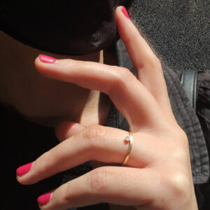 Anell de la col.lecció Hula Hoop, format per 1 aro d'or groc de fil quadrat d'uns 1.5 mm.,entrecreuats, amb boca d'or i diamant de 0.025cts o 0.07cts.