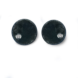 Arracades de plata ennegrida o blanca en forma de rodona d' 1.4 cm. de diametre concau, amb textura de pols de plata, amb boca de plata i circonita. Tanca ...