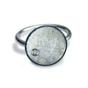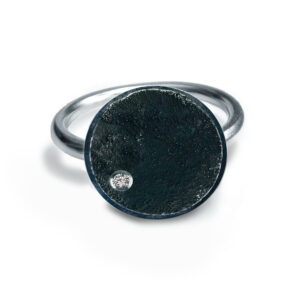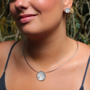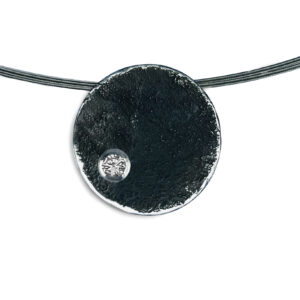 Penjoll de plata ennegrida o blanca en forma de rodona d' 2,5 cm. de diametre concau, amb textura de pols de plata i boca amb circonita de 3mm. Cordó ...