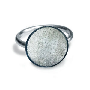 Anell de plata format per aro de fil rodó amb peça en la part soperior en forma de rodona d' 1.4 cm. de diametre concau, amb textura de pols ...