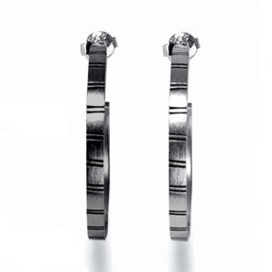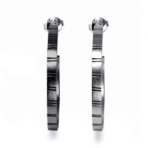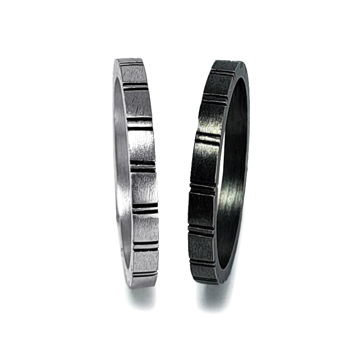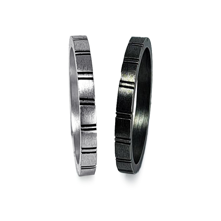 Anell de la col·lecció Cut, format per cèrcol de fil quadrat de plata d’uns 2.2 x 1.5 cm. A tota la superfície, grup de doble tall super junts, espaiats entre grups, a la superfície. Acabat mat i línies ennegrides o tot ennegrit.