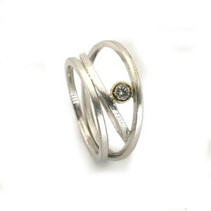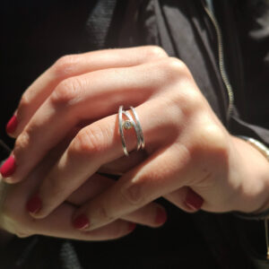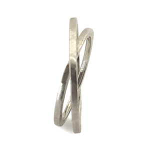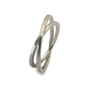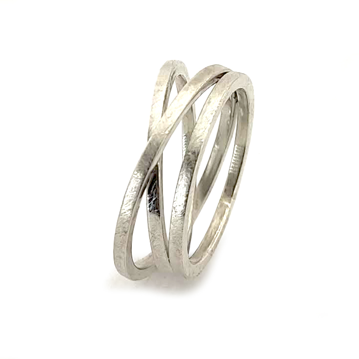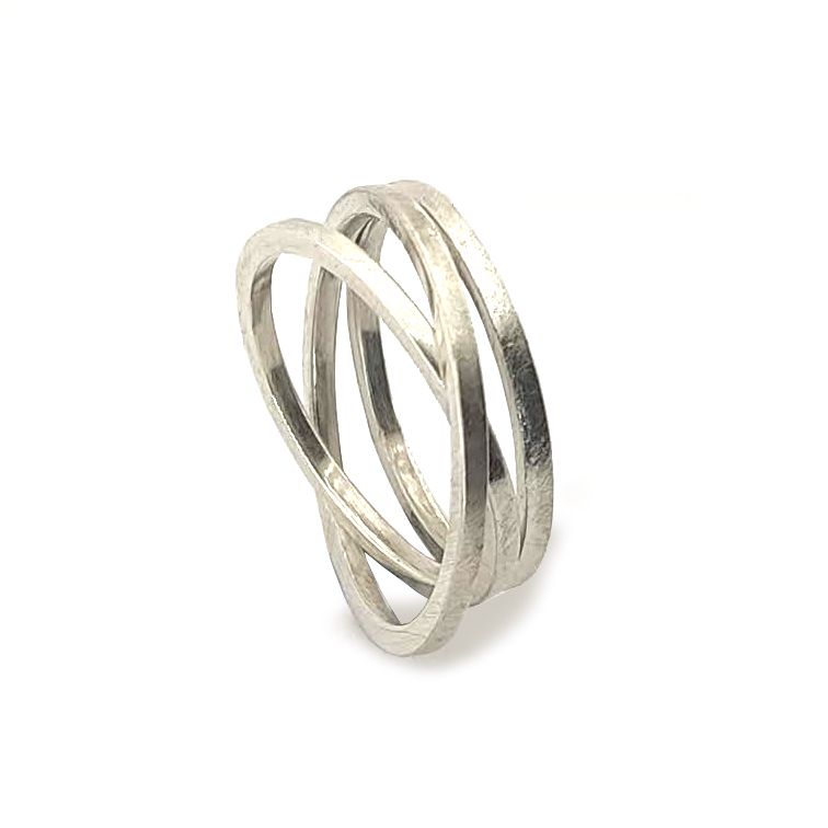 Anell de la col.lecció Hula Hoop, format per tres aros de plata, de fil quadrat d’uns 1.5 mm. entrecreuats.