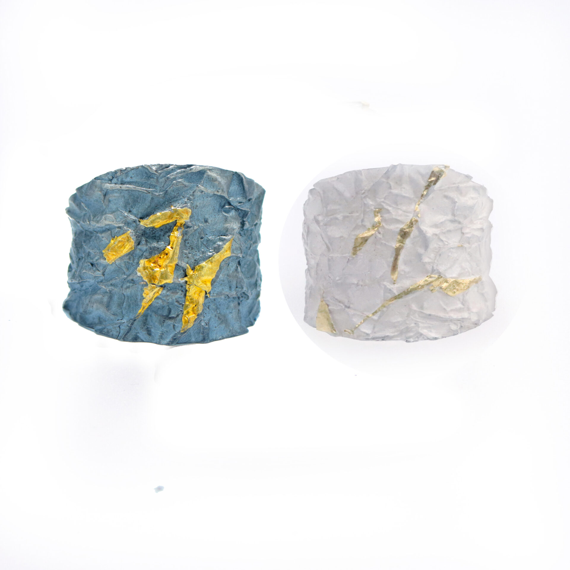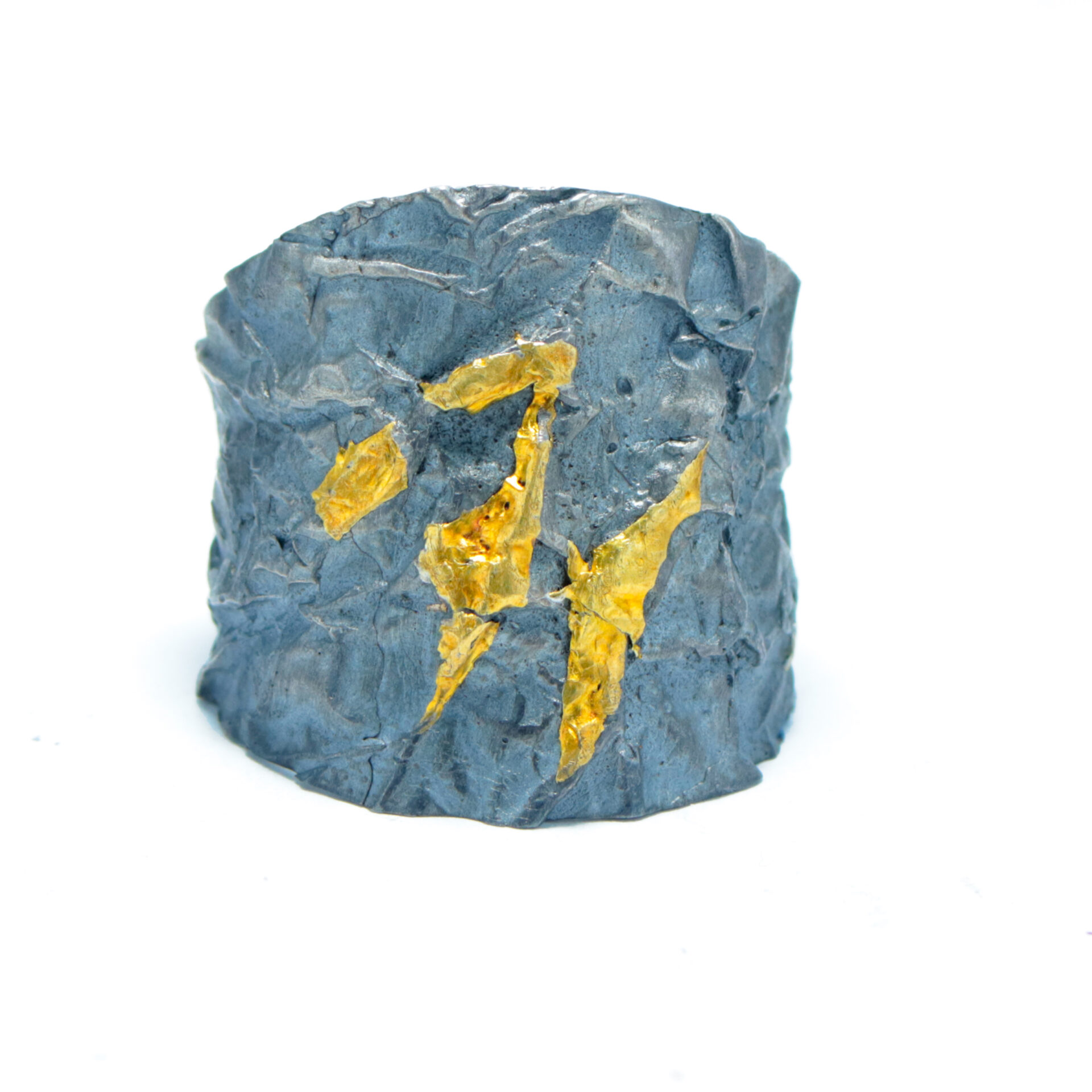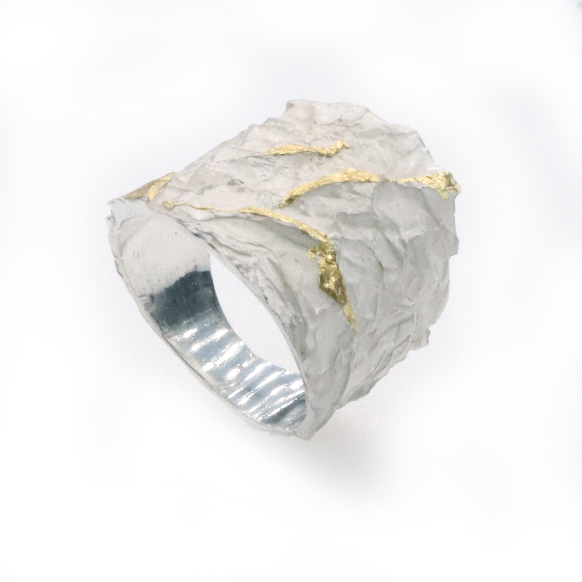 Anell de plata blanca amb textura rocosa , braç d’uns 2 cm. d’amplada amb o sense varies lamines d’or de 24 kts, Kum Boo.