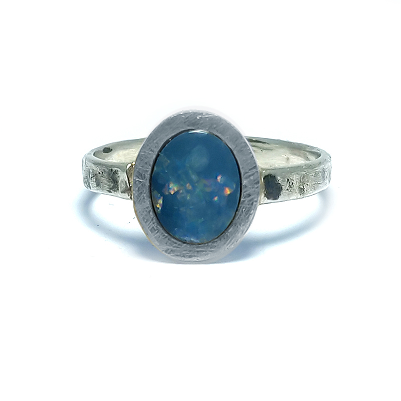 Anell de plata, aro amb texturar, d’uns 0.3cm d’amplada amb part superior, boca ovalada de plata amb o sense part superior lamina d’or de 24 kts, Kum Boo, i òpal ovalat d’uns 1cm. x 1.3cm