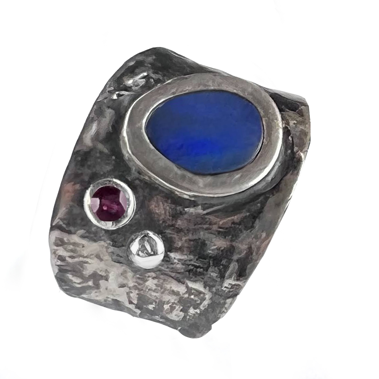 Anell de plata ennegrida amb textura rugosa suau, braç d’uns 1.8cm. d’amplada , amb part inferior afuada. Boca triangular arrodonida de plata i òpal ovalat d’uns 0.9cm. x 0.7cm. Bola i boca de plata amb diamant granat.