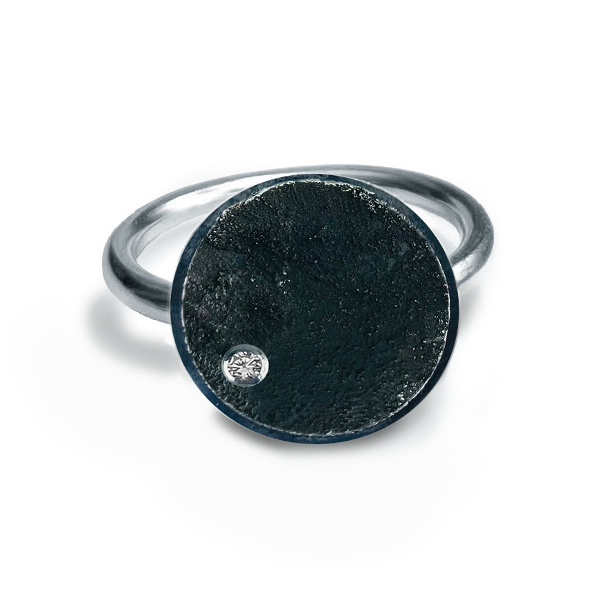 Anell de plata format per aro de fil rodó amb peça en la part superior en forma de rodona d’ 1.4 cm. de diametre concau, amb textura de pols de plata, amb boca de plata i circonita de 2mm