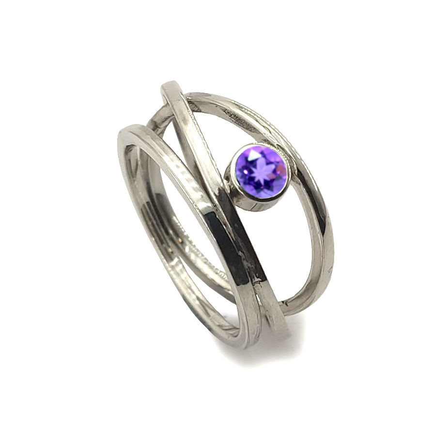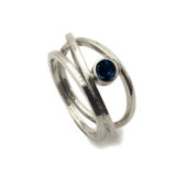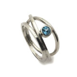 Anell de la col.lecció Hula Hoop, format per tres aros de plata, de fil quadrat d’uns 1.5 mm. entrecreuats i boca rodonade plata amb pedra.