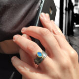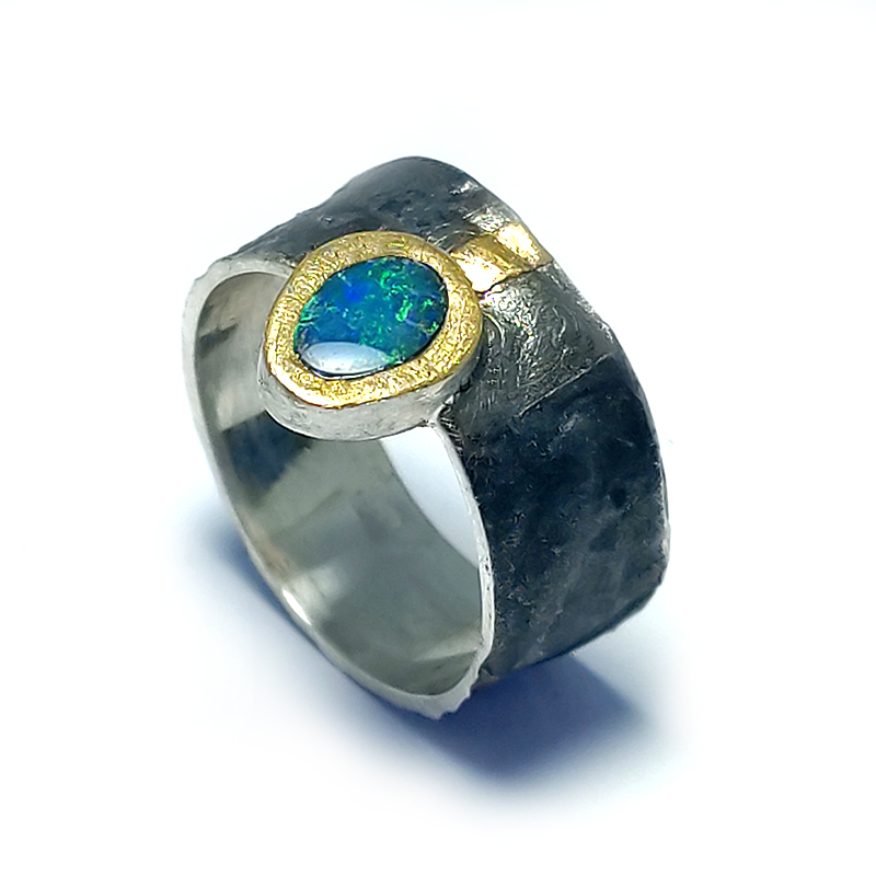 Anell de plata ennegrida amb textura rocosa suau, braç d’uns 0.8cm. d’ampladaamb lines d’or de 24kts, Kum Boo. En un lateral, boca triangular arrodonida de plata amb part superior lamina d’or de 24 kts, Kum Boo, i òpal ovalat d’uns 0.8cm. x 0.9cm.
