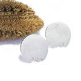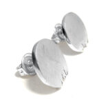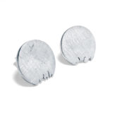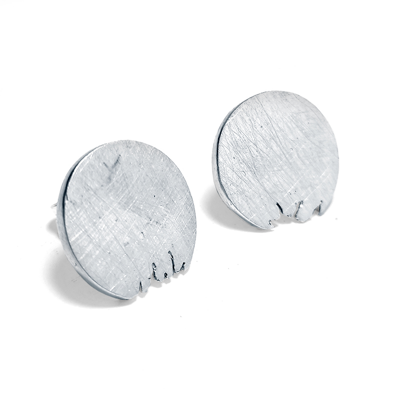 Arracada de plata, d’uns 1,4 cm. de diàmetre, en forma de rodona amb mosegada. Tanca a pressió de plata. Acabat mate ratllat o polit.