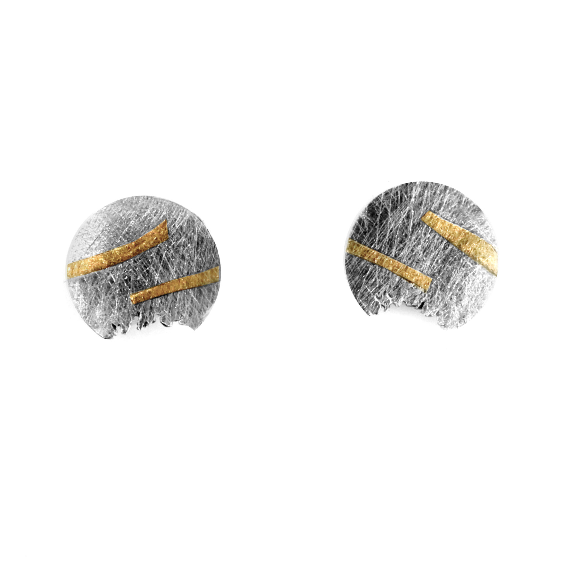 Arracada de plata i or de 24 K, d’uns 1,2 cm. de diàmetre, en forma de rodona amb mosegada i 2 lineas d’or Kumm Boo. Tanca a pressió de plata. Acabat plata ratllada .