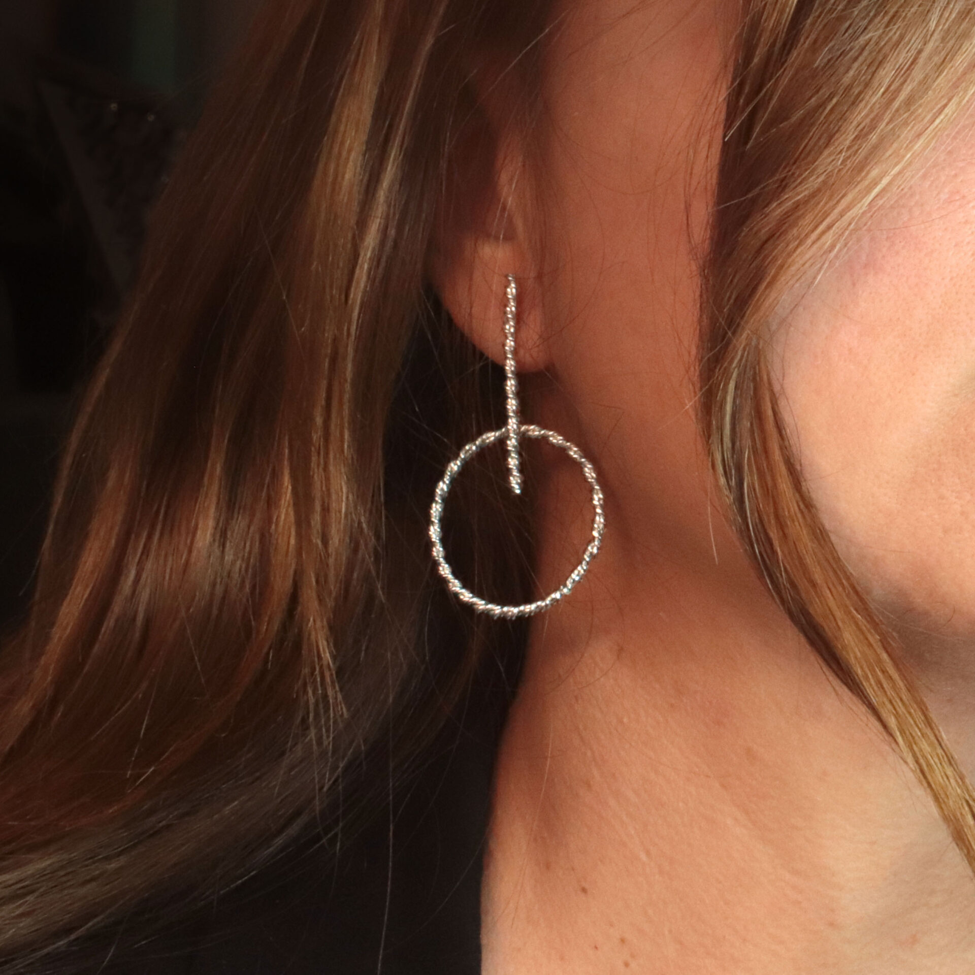Arracades criolla de la col.lecció Junc de plata, coure o llautó polit formada per tira vertical d’uns 3.5cm de llargada de fil trenat i aro mòvil de fil trenat d’uns 2.8cm de diametre. Pressió de plata.