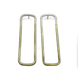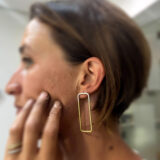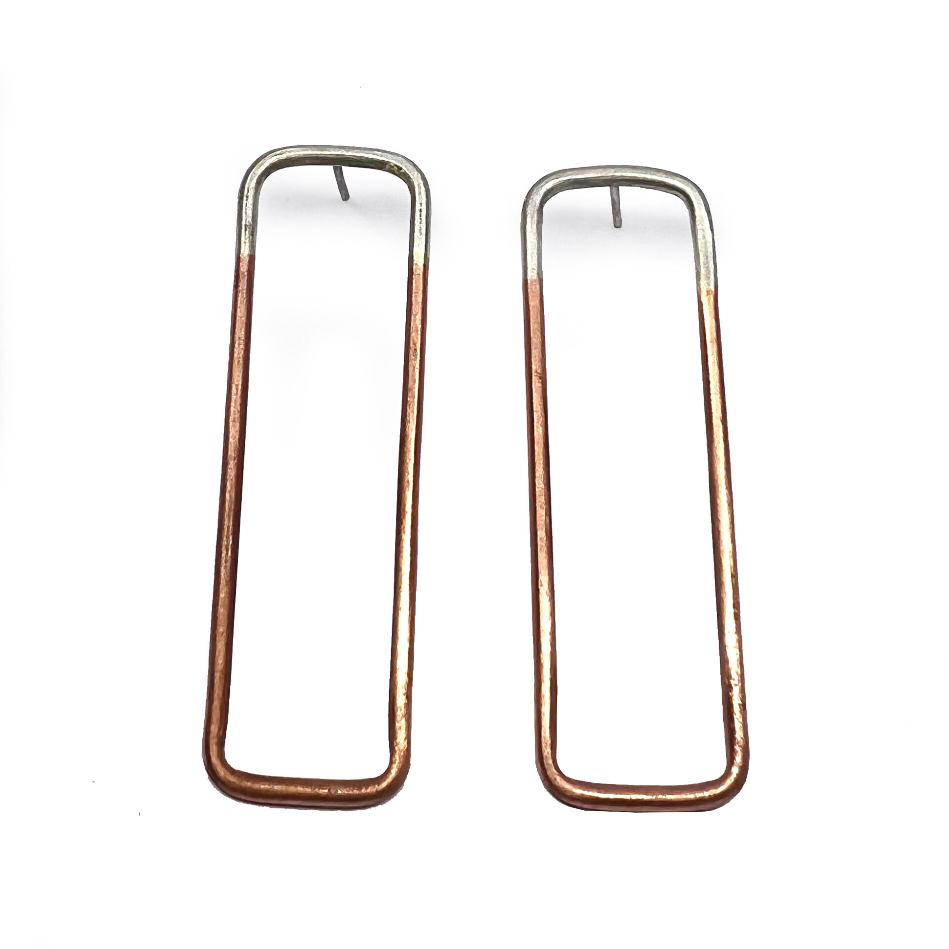 Arracades de la col.lecció Hoops, format per peça rectangular d’uns 5.1×1.5cm format per fil rodó d’uns 0.2cm de gruix, amb part de plata i part de coure o llautó. Berga i pressió de plata.