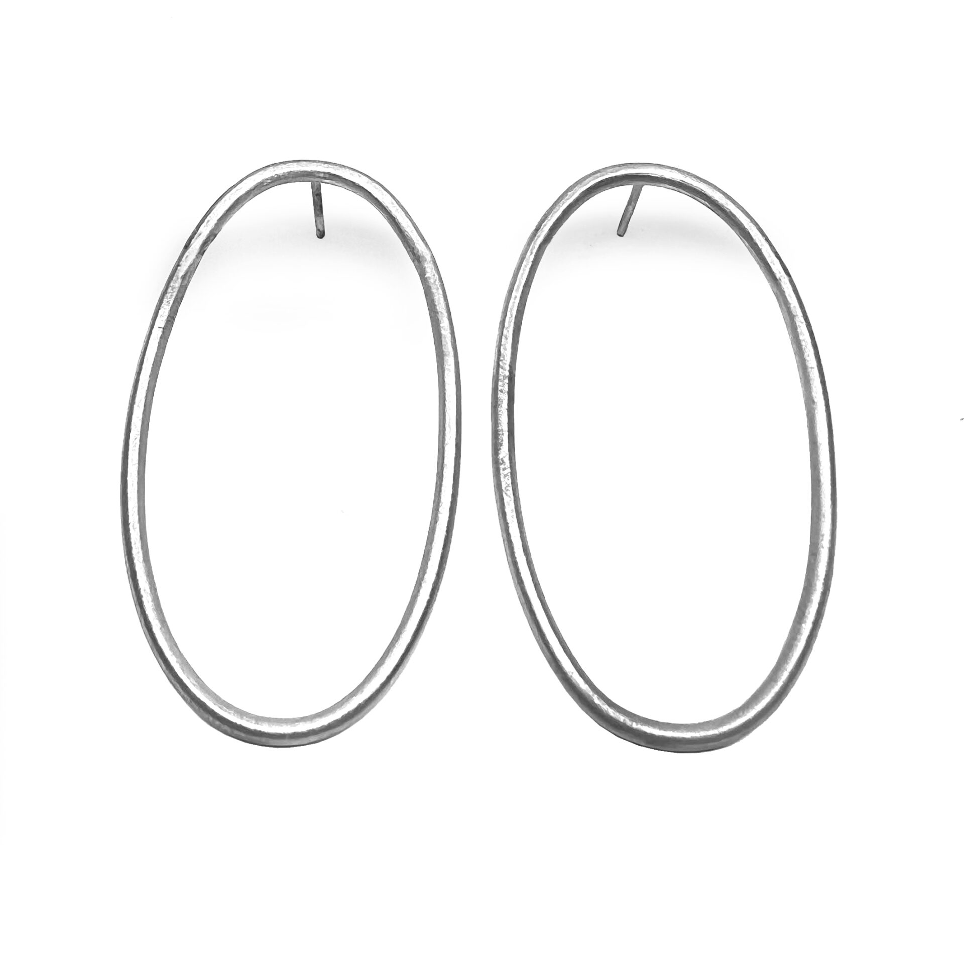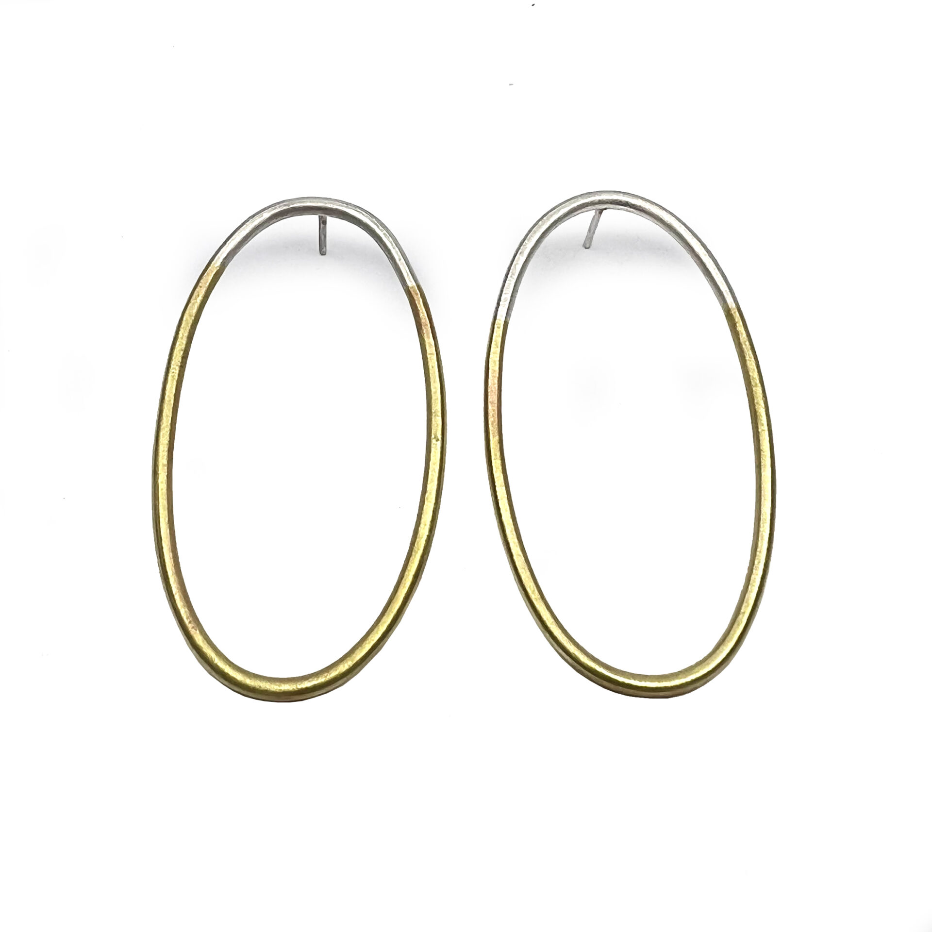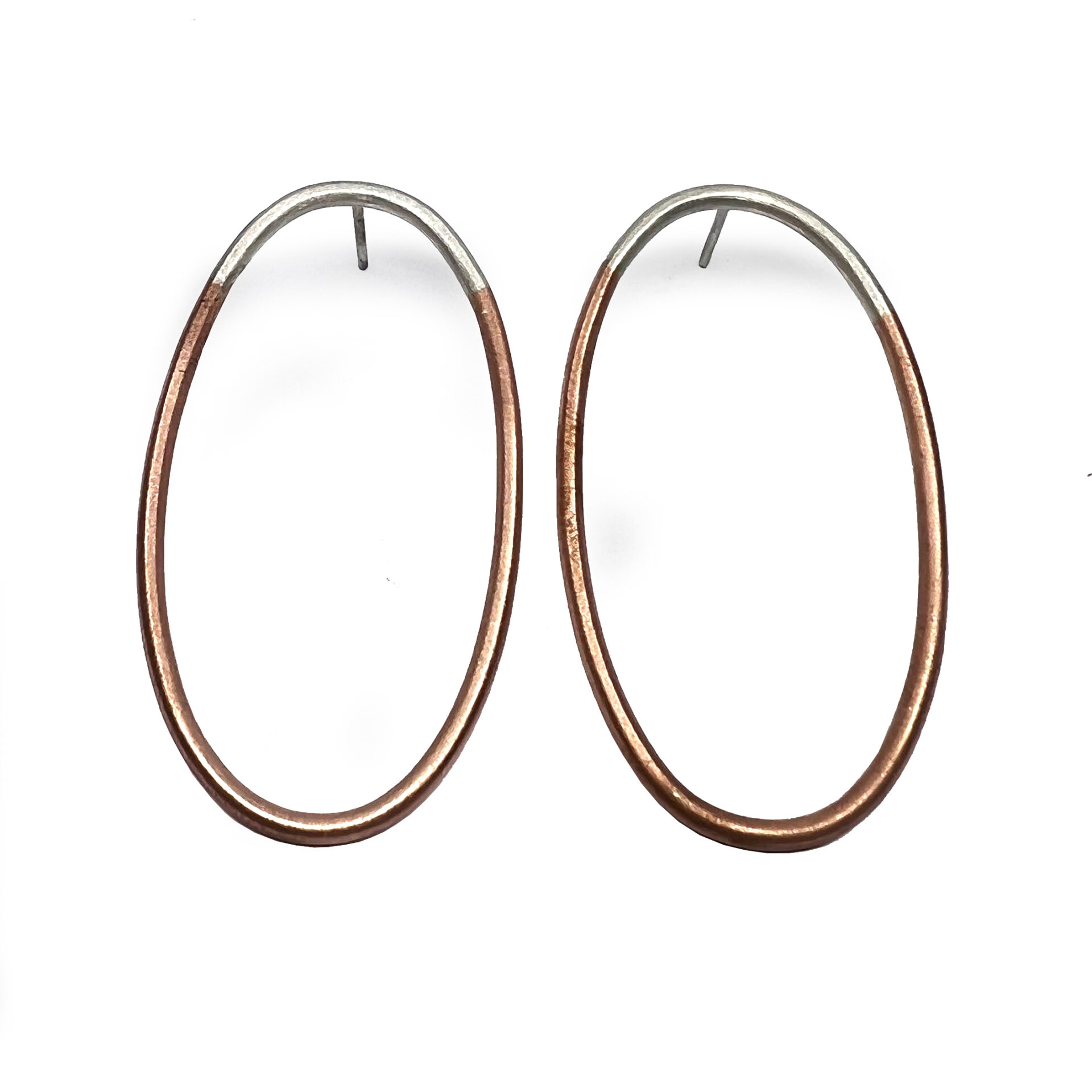 Arracades de la col.lecció Hoops, format per peça ovalada d’uns 5.1×2.6cm format per fil rodó d’uns 0.2cm de gruix, amb part de plata i part de coure o llautó. Berga i pressió de plata.