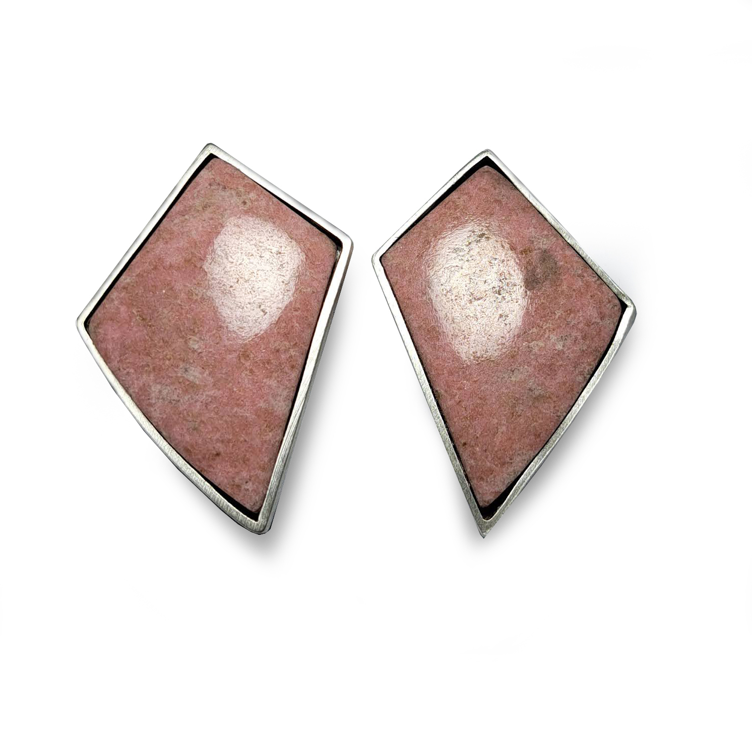 Arracades de plata amb Thulita rosa, en forma rombo irregular d’uns 3.2 x 2.2 cm de diametre, amb marc de fil quadrat de plata. Tanca pressió de plata.