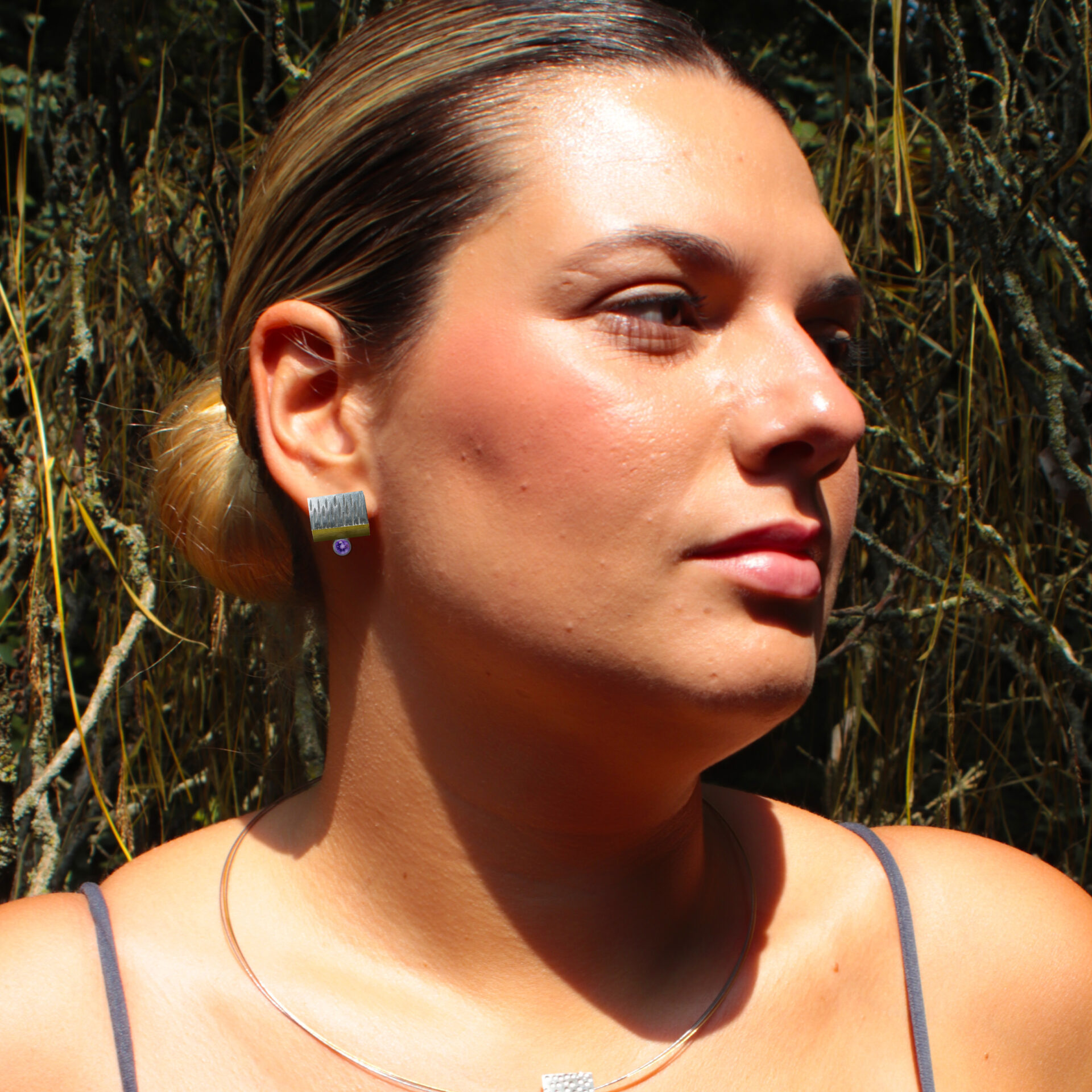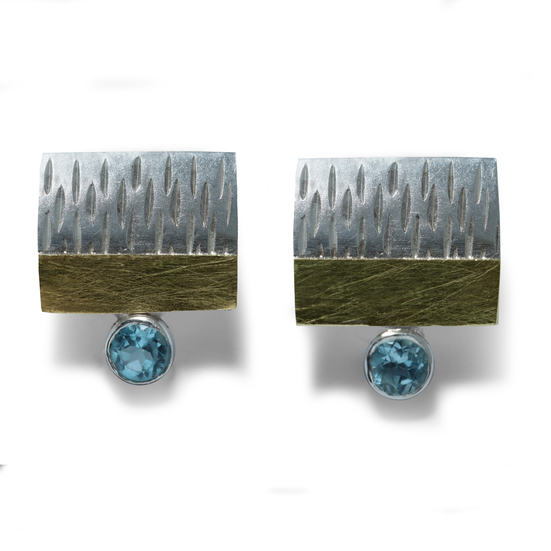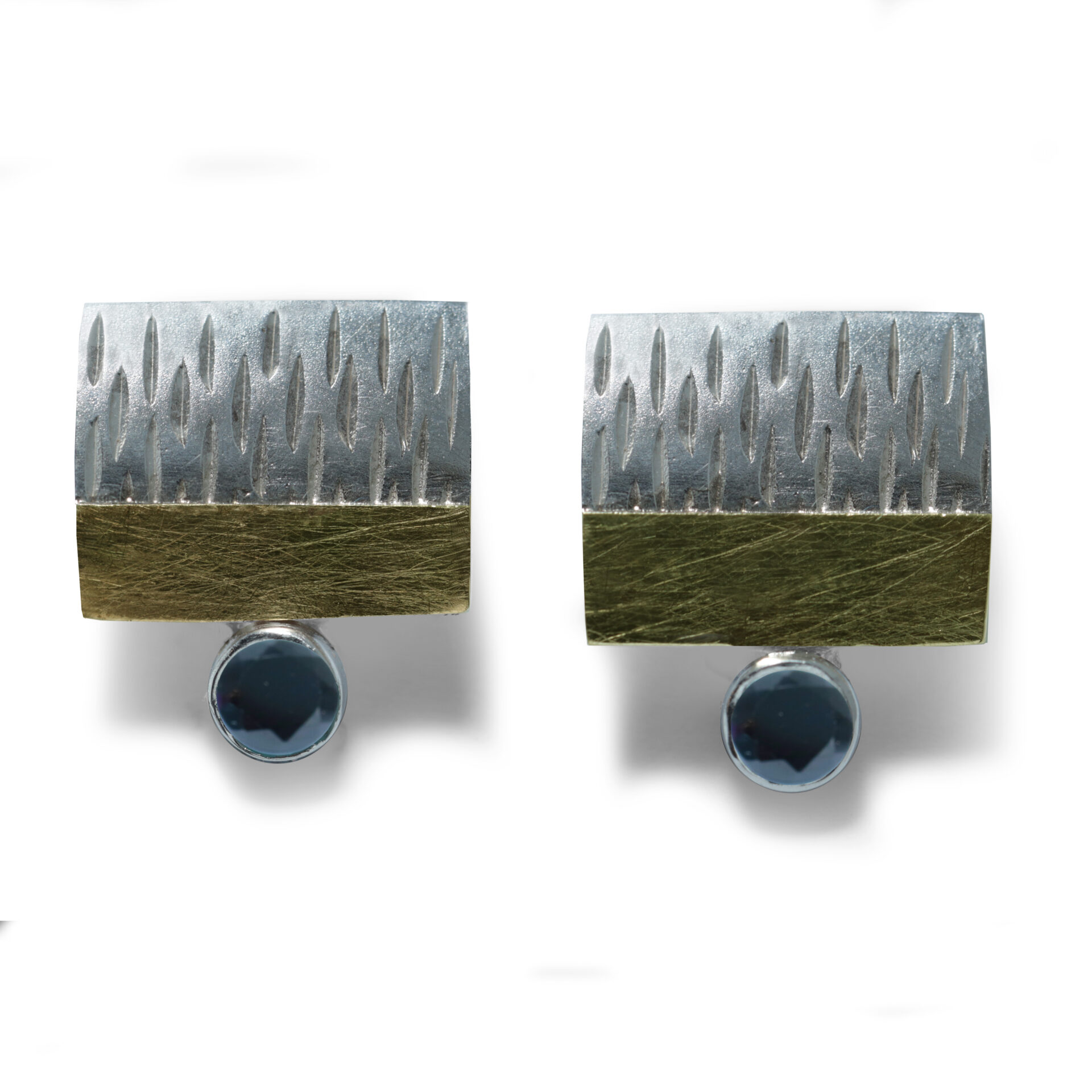 Arracades de plata en forma de rectangle duns x cm damplada amb acabat amb ratlles En la part inferior linea dor groc de kts mate ratllada i boca amb pedra de mm de diametre Tanca pressió de plata