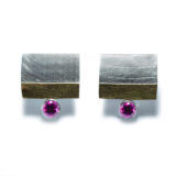 Arracades de plata en forma de rectangle d’uns 1.5 x 1.3 cm d’amplada, amb acabat lliç. En la part inferior , linea d’or groc de 18 kts mate ratllada, i boca amb pedra de 4mm de diametre. Tanca pressió de plata.