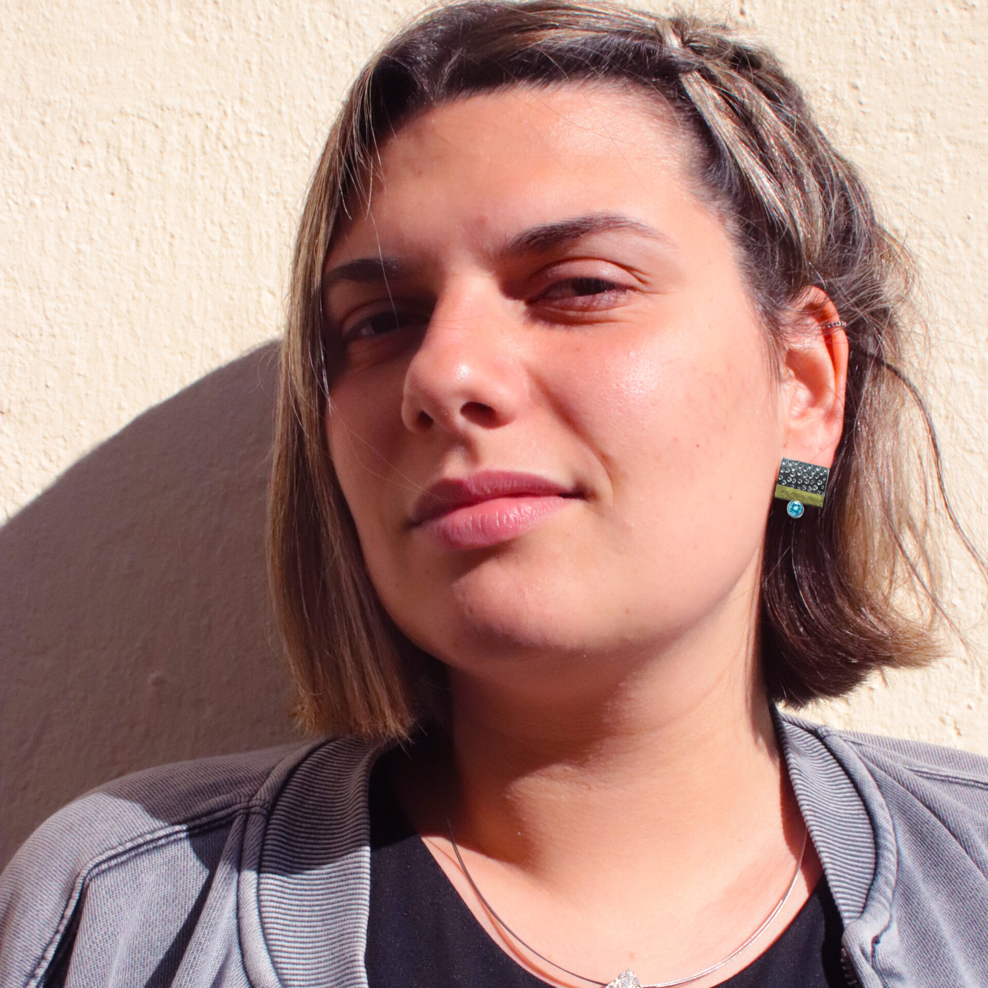 Arracades de plata en forma de rectangle d’uns 1.5 x 1.3 cm d’amplada, amb acabat lliç. En la part inferior , linea d’or groc de 18 kts mate ratllada, i boca amb pedra de 4mm de diametre. Tanca press
