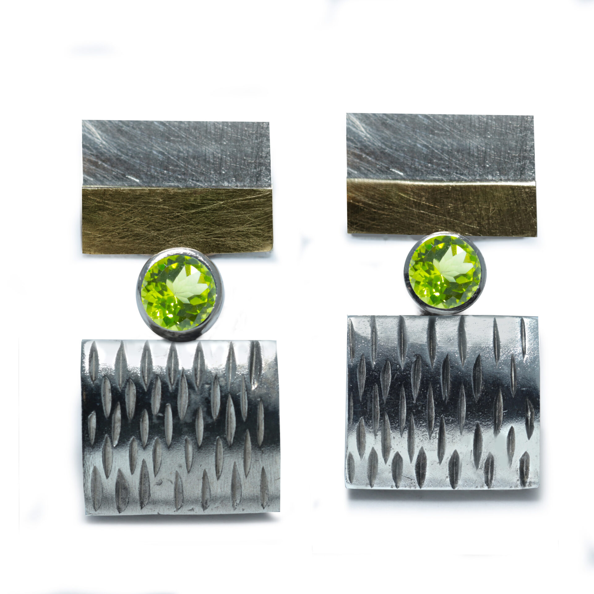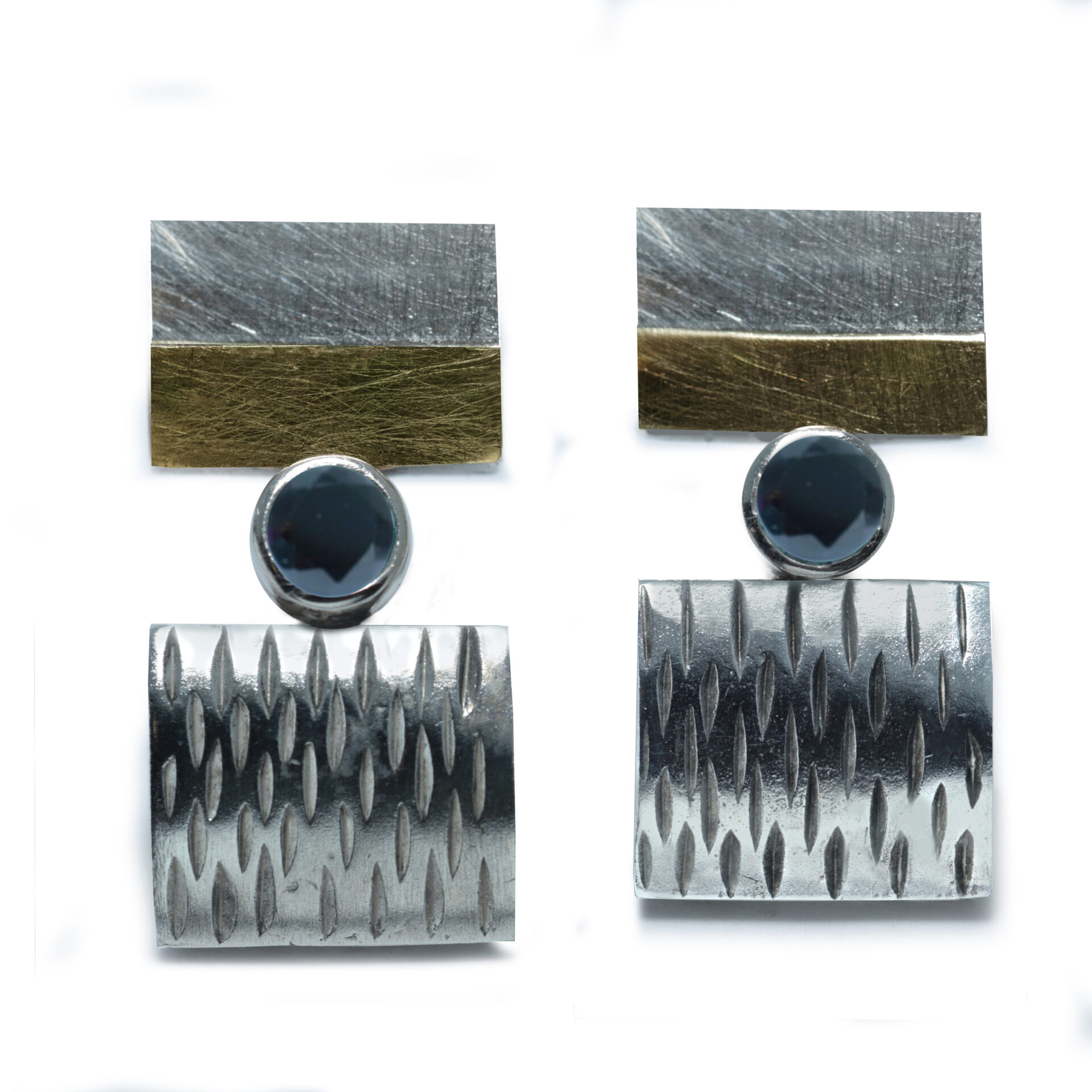 Arracades de plata format per dos rectangles el superior duns x cm damplada amb acabat lliç En la part inferior daquest rectangle linea dor groc de kts mate ratllada el segon rectangle duna x cm damplada amb acabat amb ratlles i entre aquests rectangles boca amb pedra de mm de diametre Tanca pressió de plata