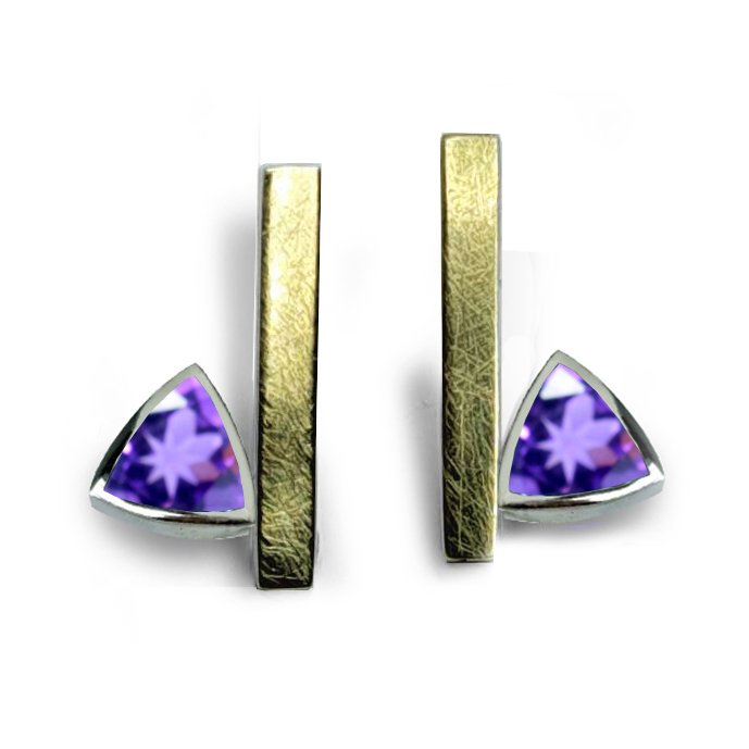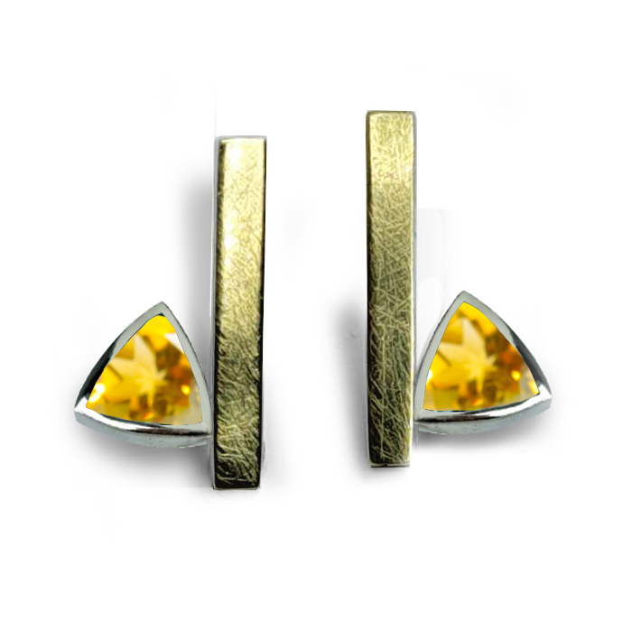 Arracades de la col.lecció Lili, format per rectangle d’uns 1.5×0.2cm de plata amb la part superior amb una làmina d’or groc, i en un costat, boca triangular ( Delta ) de plata amb pedra de 3×3 o 5×5.