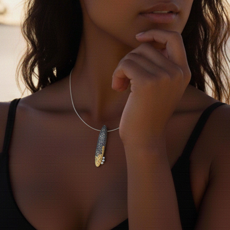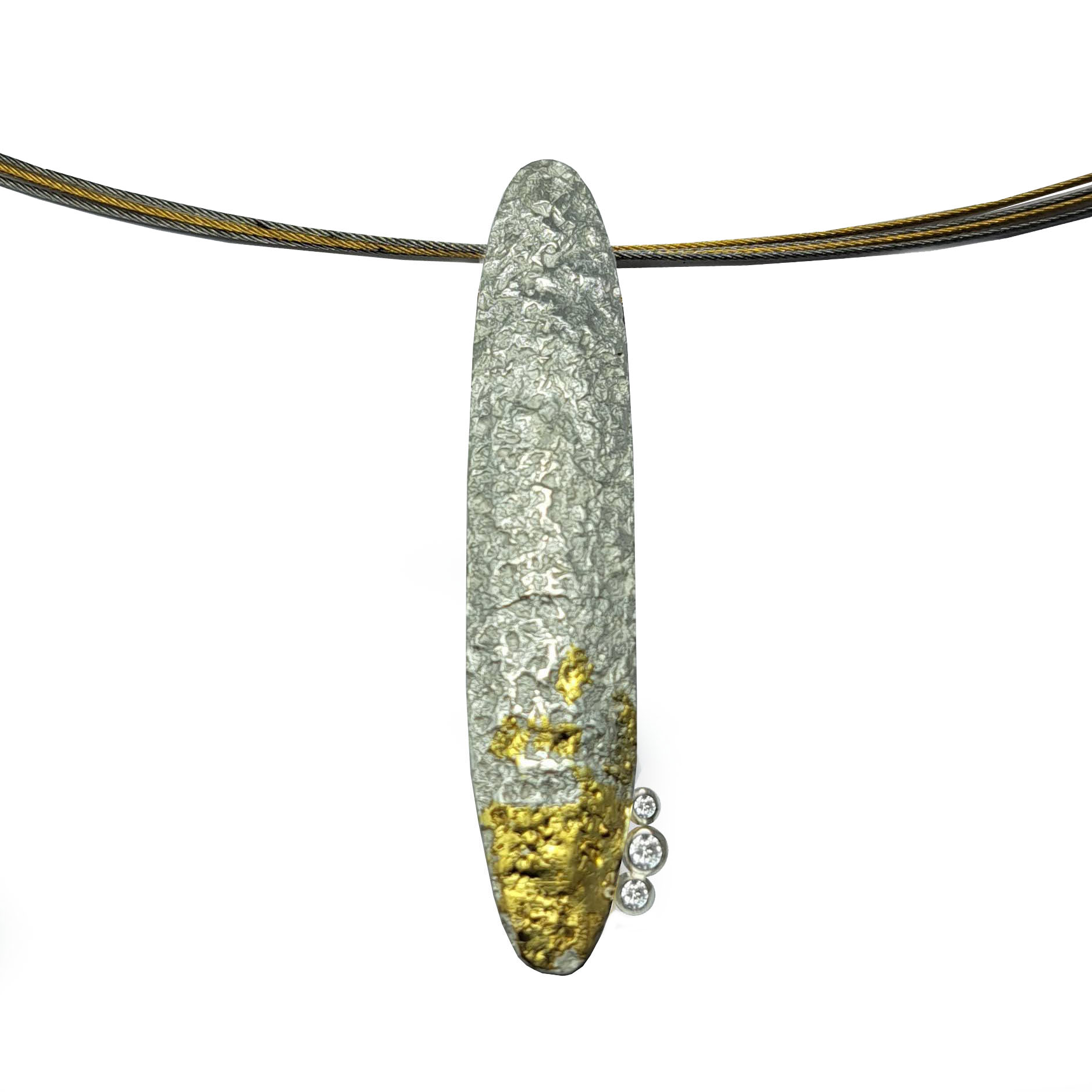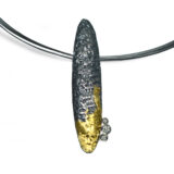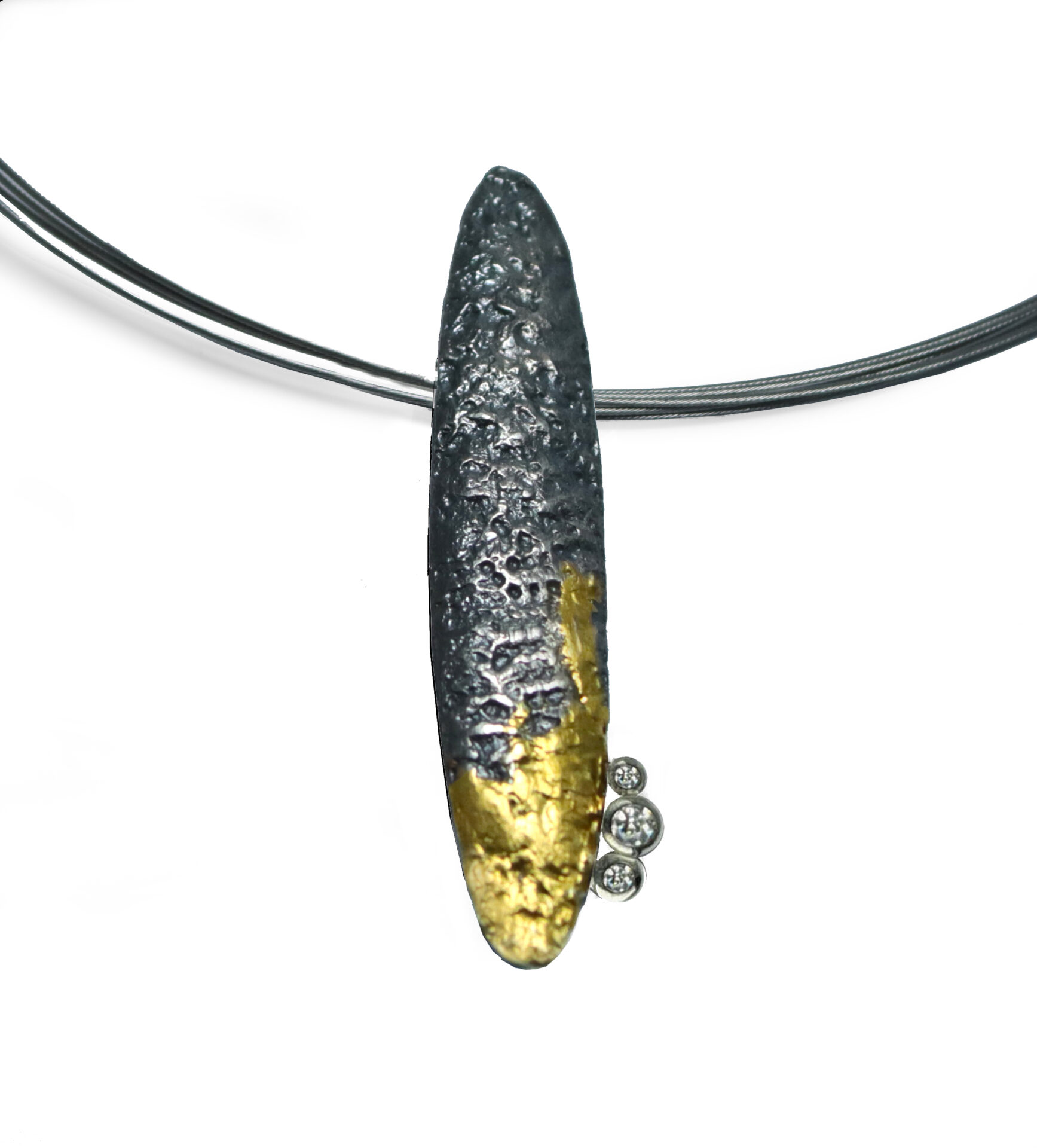 Penjoll de la col.lecció BRAVA, de plata en forma ovalada concava amb textura terrosa d’uns 5cm.de llargada, ambo sense part d’ella amb or de 24 kilats (Kum Boo). En un laterar, boca d’or amb diaman