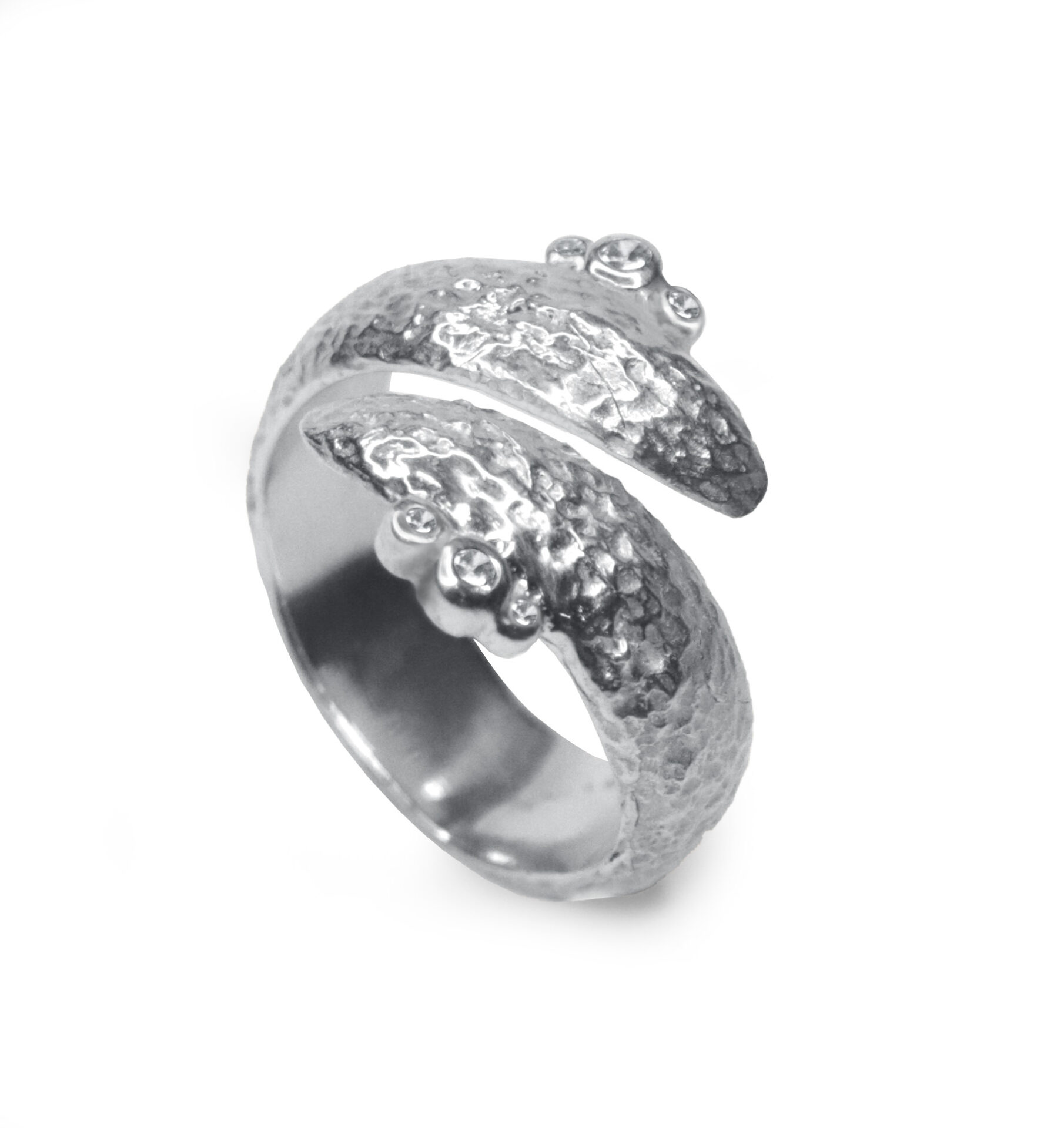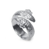 Anell de la col.lecció BRAVA, aro obert de plata brillant format per fil concab d’uns 0.6cm d’amplada amb textura terrosa d’uns 4cm.de llargada. En cada extrem, en un laterar, 3 boques de plata de diferentes mides amb circonites.