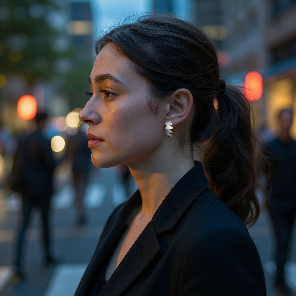 Arracada de la col.lecció FITA, 5 peces de plata en forma de pedrade divereses mides amb acabat ratllat. Amb certa corva. Tanca pressió de plata.