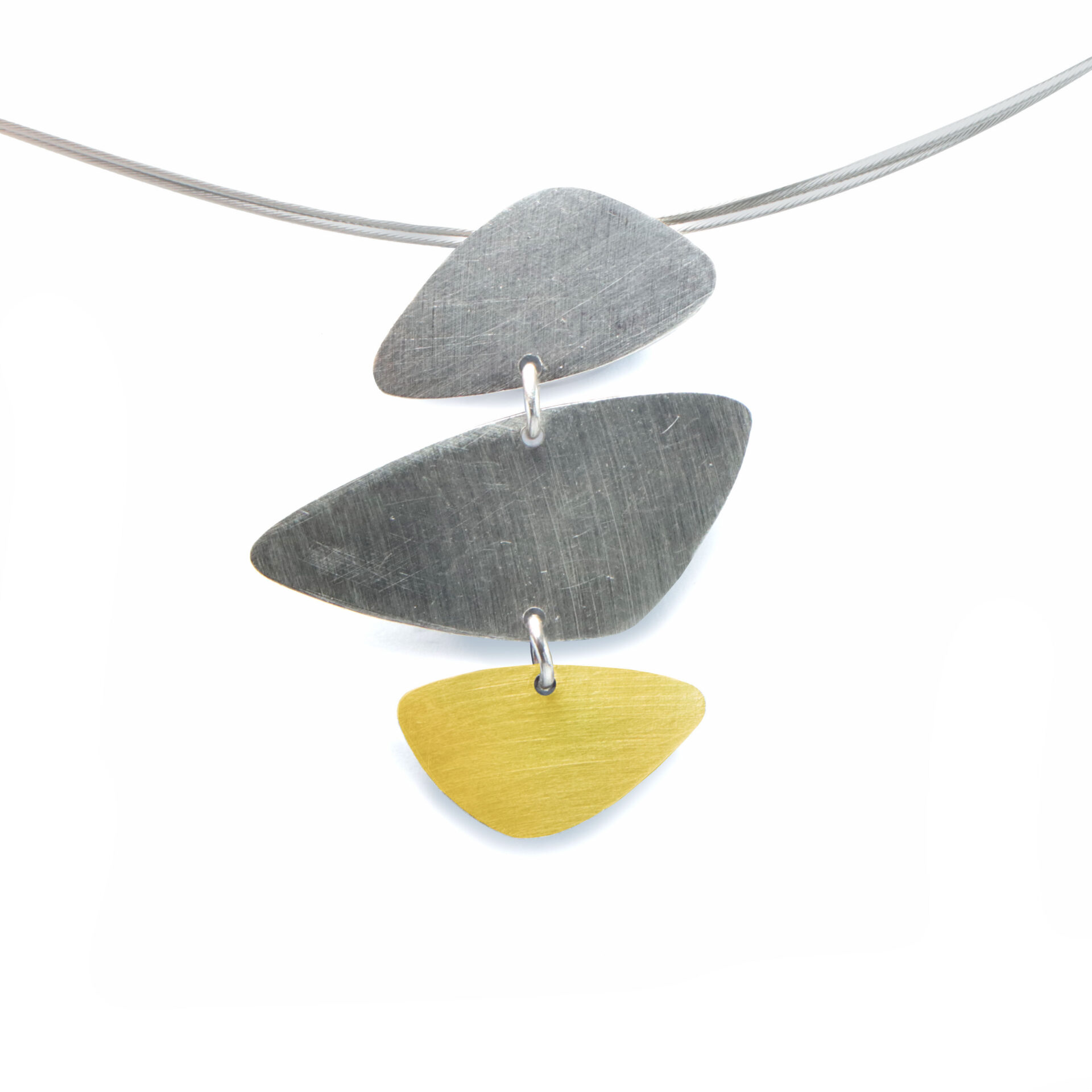 Penjoll de la col.lecció FITA, 3 peces de plata en forma de pedra d’uns 1.5×0.8, 2.1×1.1cm,1×0.8 amb acabat ratllat, aquesta ultima, soldada per sobre, làmina d’or groc . Entre peça i peça, anella, fe