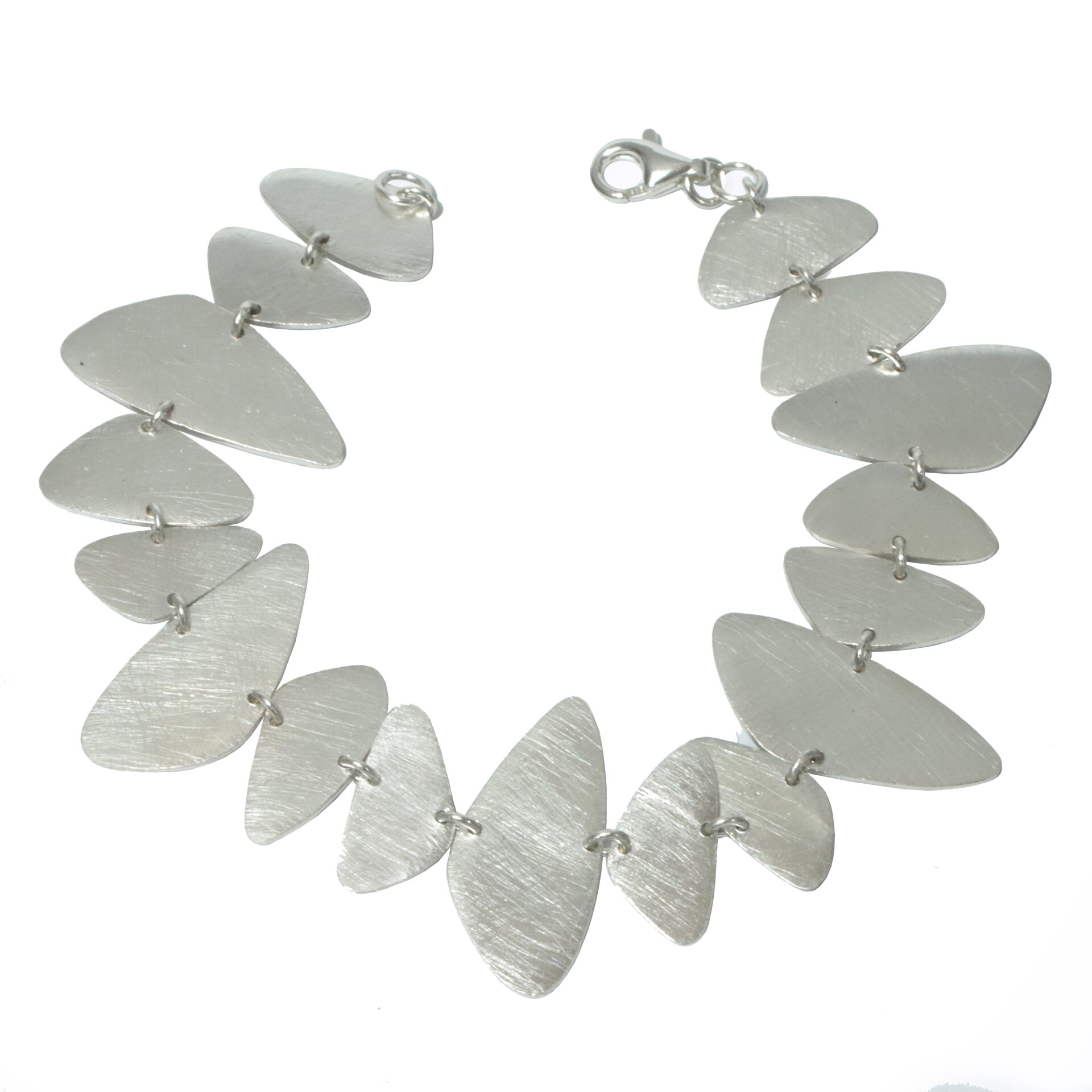 Polsera de la col.lecció FITA, 17 peces de plata en forma de pedra d’uns 1.5×0.8, 2.1×1.1cm,1×0.8 amb acabat ratllat. Entre peça i peça, anella, fent mobil la polsera. Tanca mosquetó de plata.