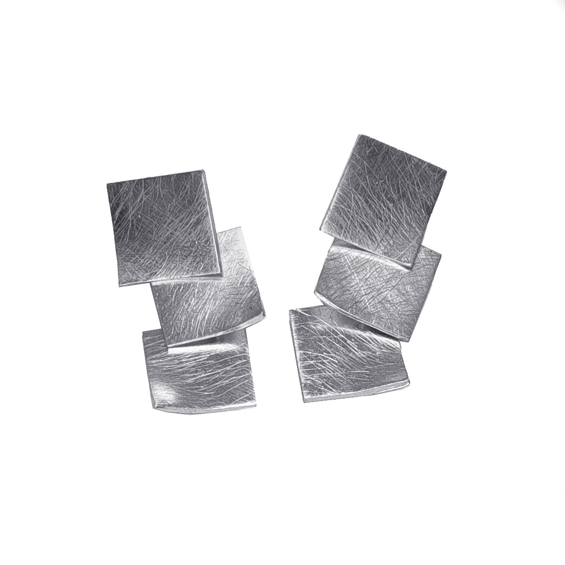 Arracades de la col.lecció Foli, de plata en forma de 3 quadrats d’uns 1cm , amb una cantonada aixecada . Tanca pressió.