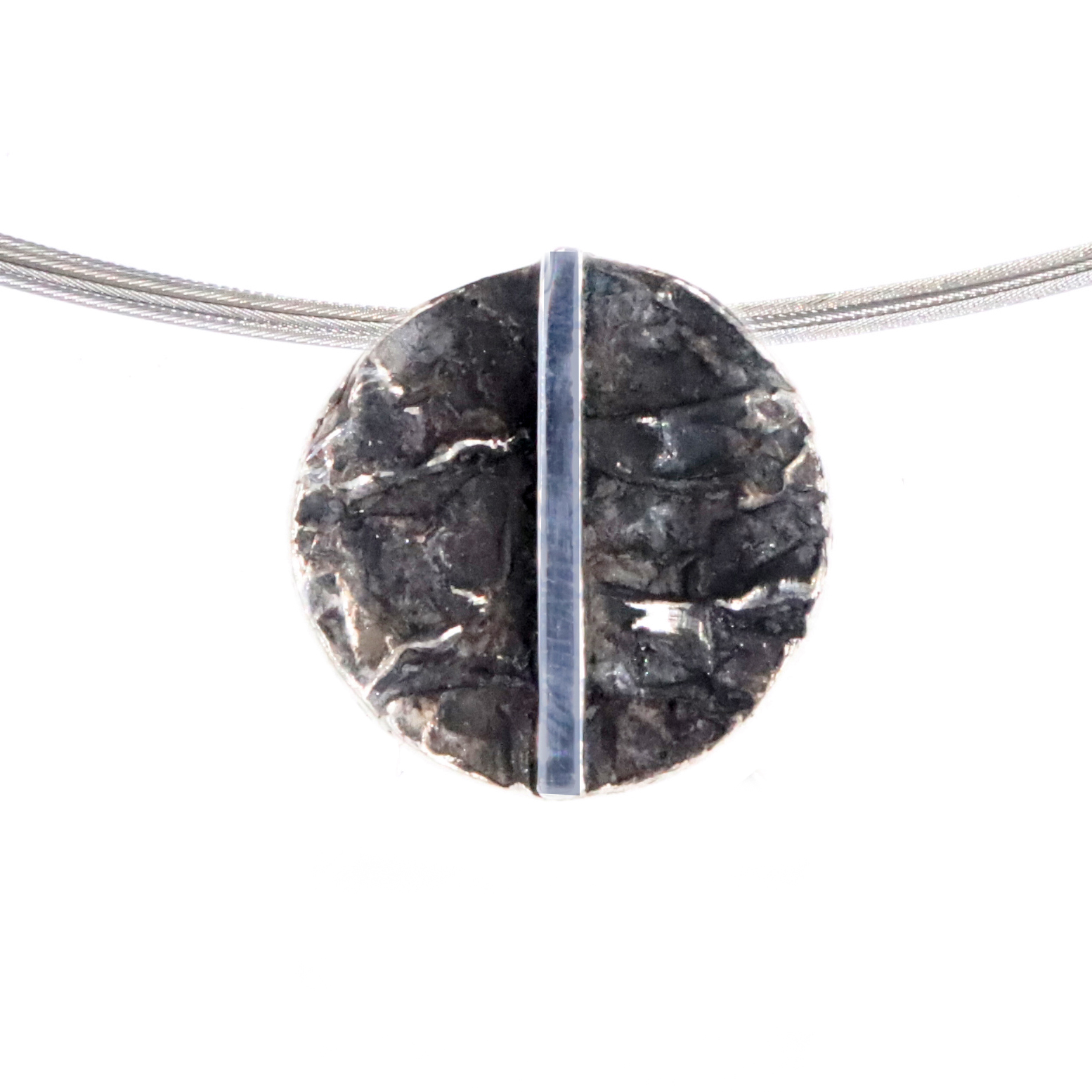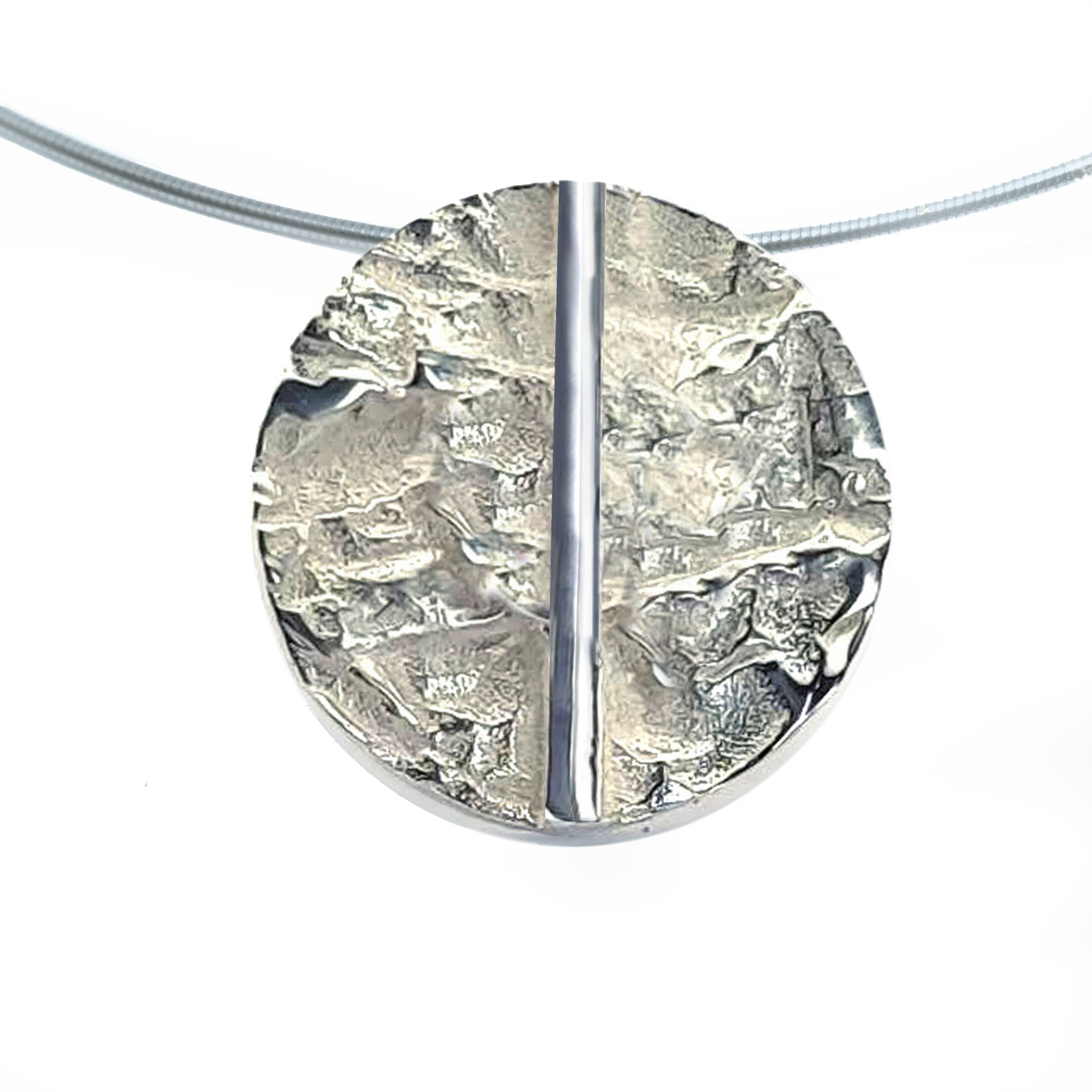 Penjoll de la col.lecció Galaxia , rodona d’uns 1.8 cm. de diametre amb textura de plecs de plata i fil cuadrat de plata brillant. Cordó no inclós.
