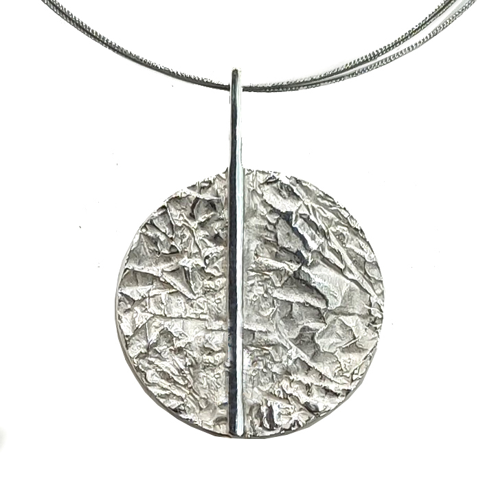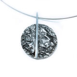 Penjoll de la col.lecció Galaxia , rodona d’uns 2.8 cm. de diametre amb textura de plecs de plata ennegrida i fil cuadrat vertical de plata brillant. Cordó no inclós inclós.