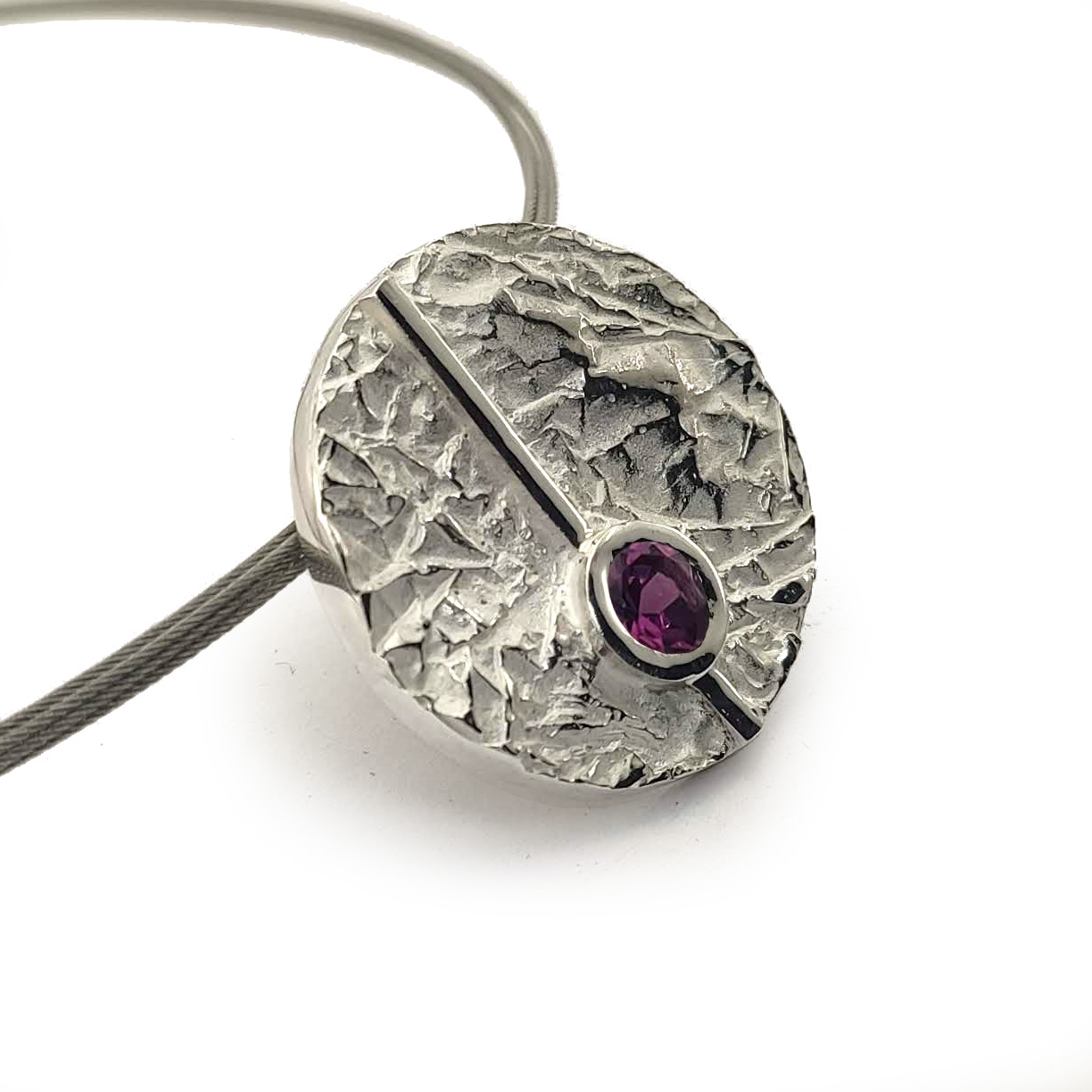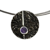 Penjoll de la col.lecció Galaxia , rodona d’uns 2.8 cm. de diametre amb textura de plecs de plata ennegrida i fil cuadrat de plata brillant. Amb o sense boca rodona amb una pedra de 5mm de diàmetre. C