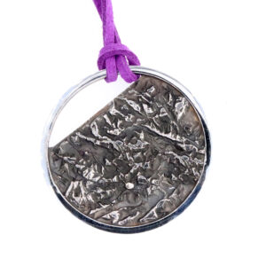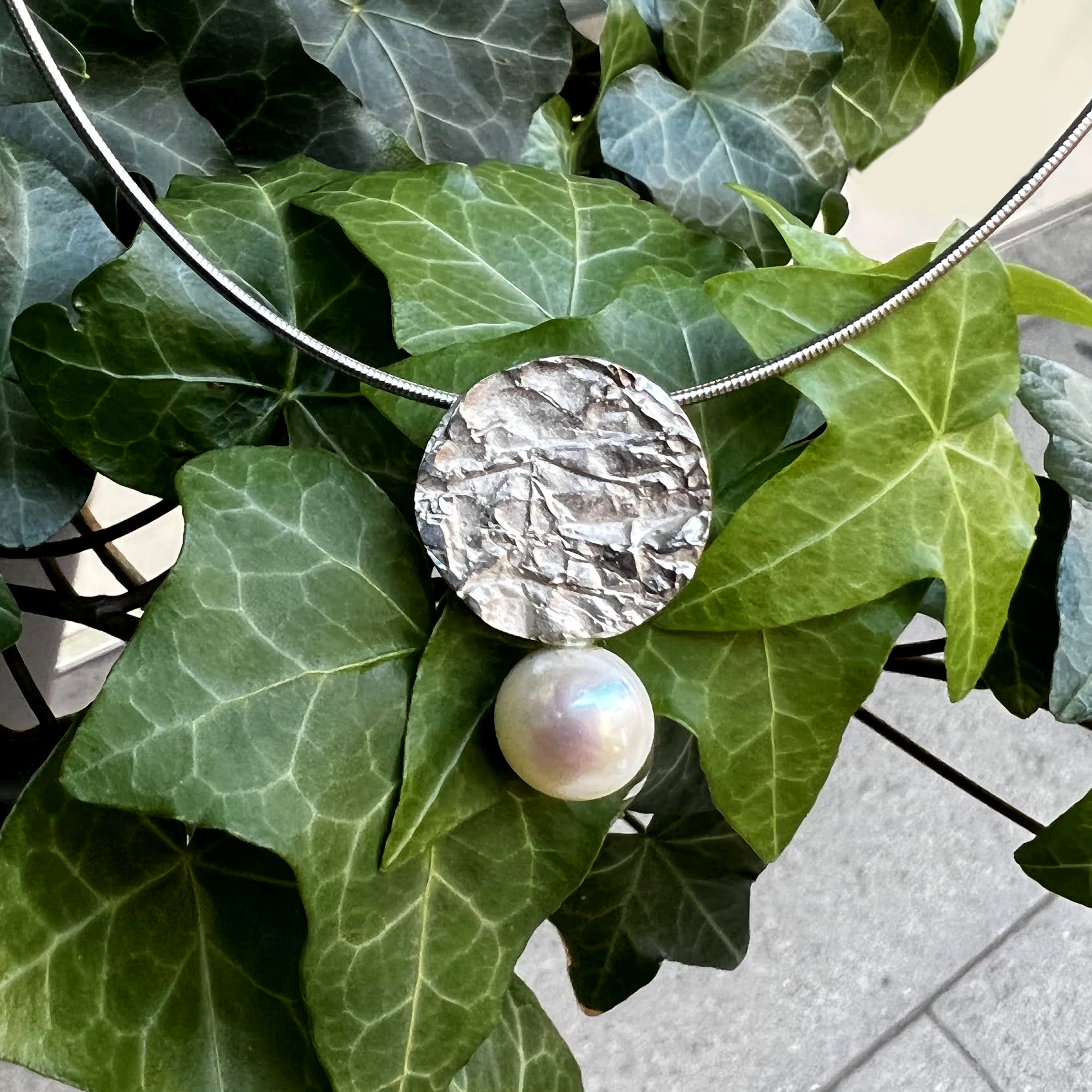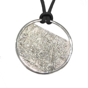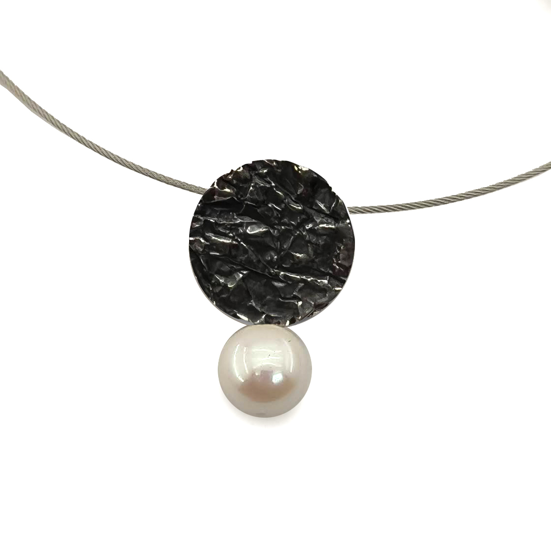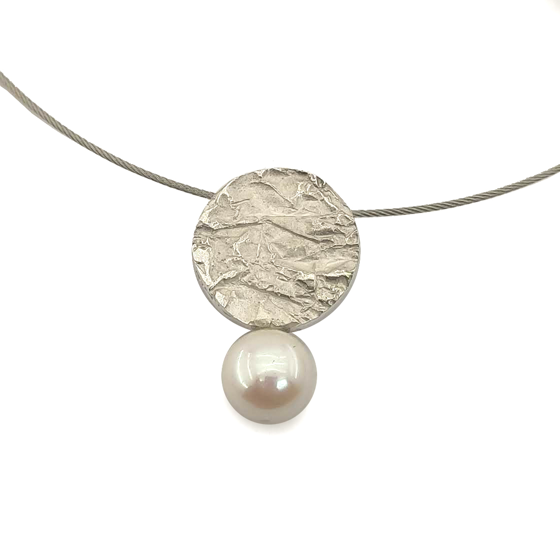 Penjoll de la col.lecció Galaxia , rodona d’uns 1.8 cm. de diametre amb textura de plecs de plata i perla irregular blanca. Cordó no inclós.