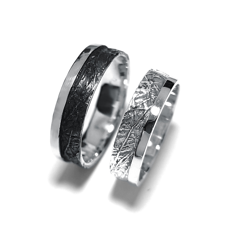 Anell de la col.lecció Galaxia d’uns 5.5 cm. amplada, format per aro prim de plata brillant en un lateral, i aro ample de plata ennegrit amb textura de fils .
