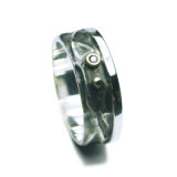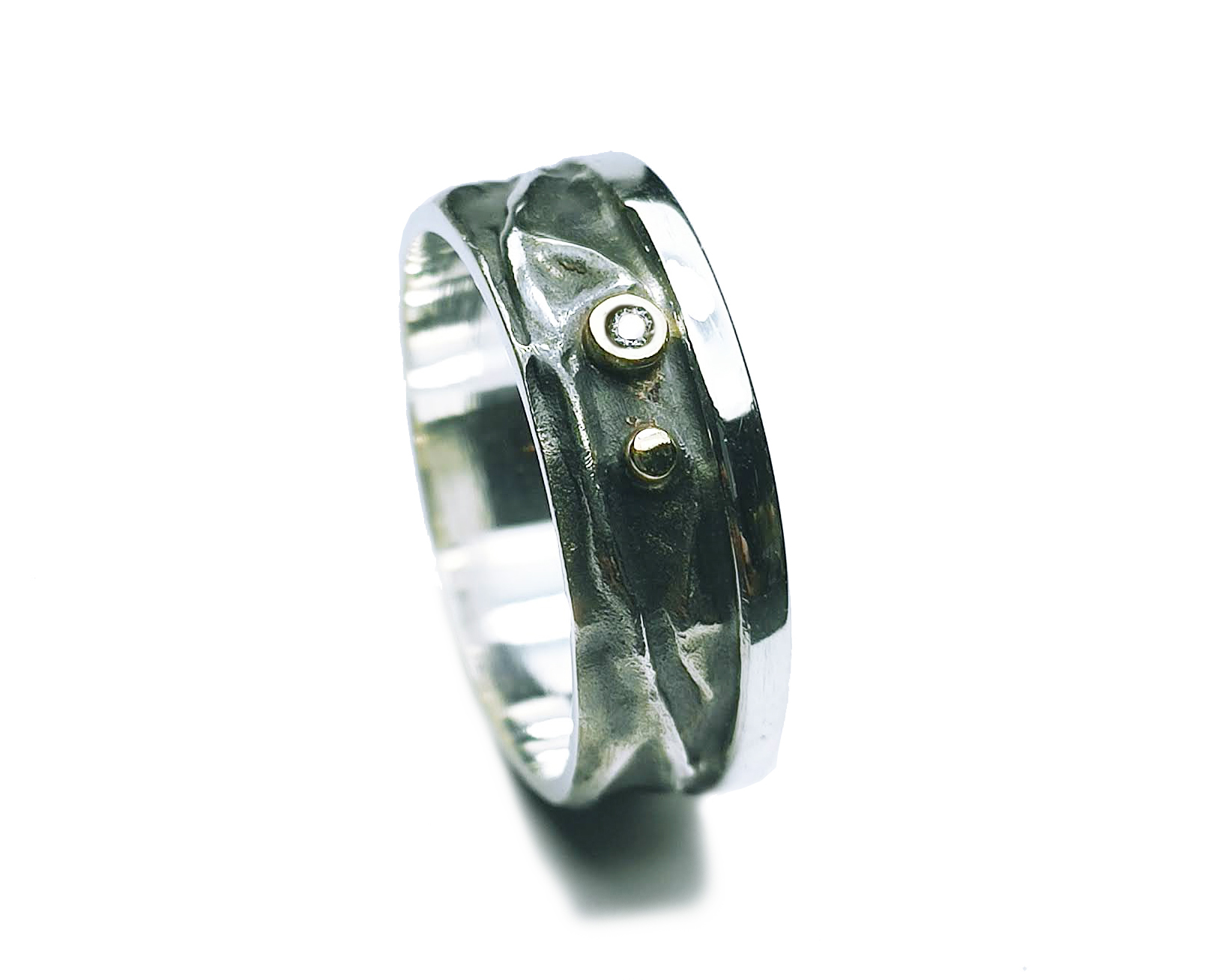 Anell de la col.lecció Galaxia d’uns 5.5 cm. amplada, format per aro prim de plata brillant en un lateral, aro ample de plata ennegrit amb textura de plecs , i amb boca rodona d’or i diamant de 0.025cts i bola d’or polit .