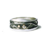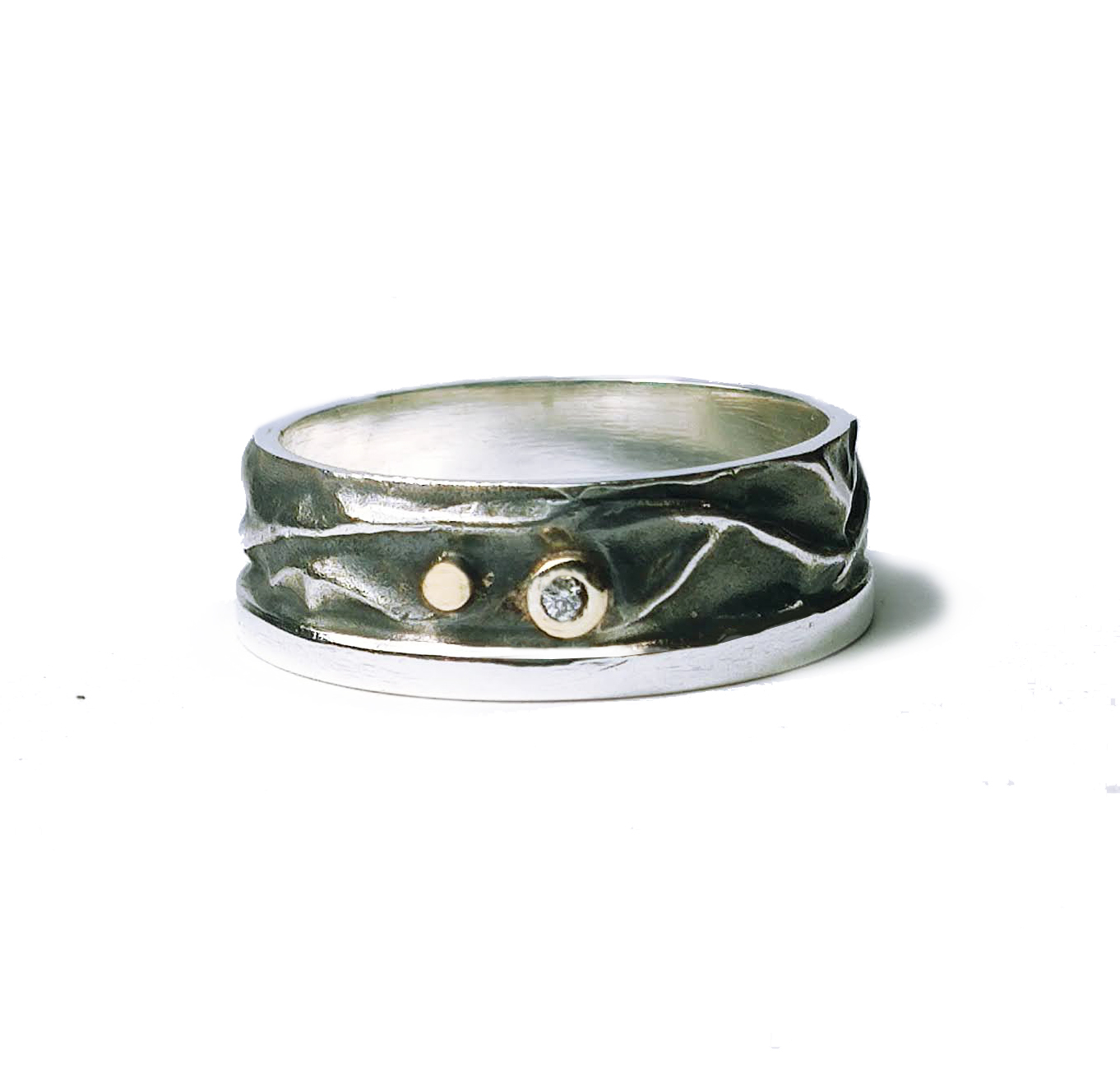 Anell de la col.lecció Galaxia d’uns 5.5 cm. amplada, format per aro prim de plata brillant en un lateral, aro ample de plata ennegrit amb textura de plecs , i amb boca rodona d’or i diamant de 0.025