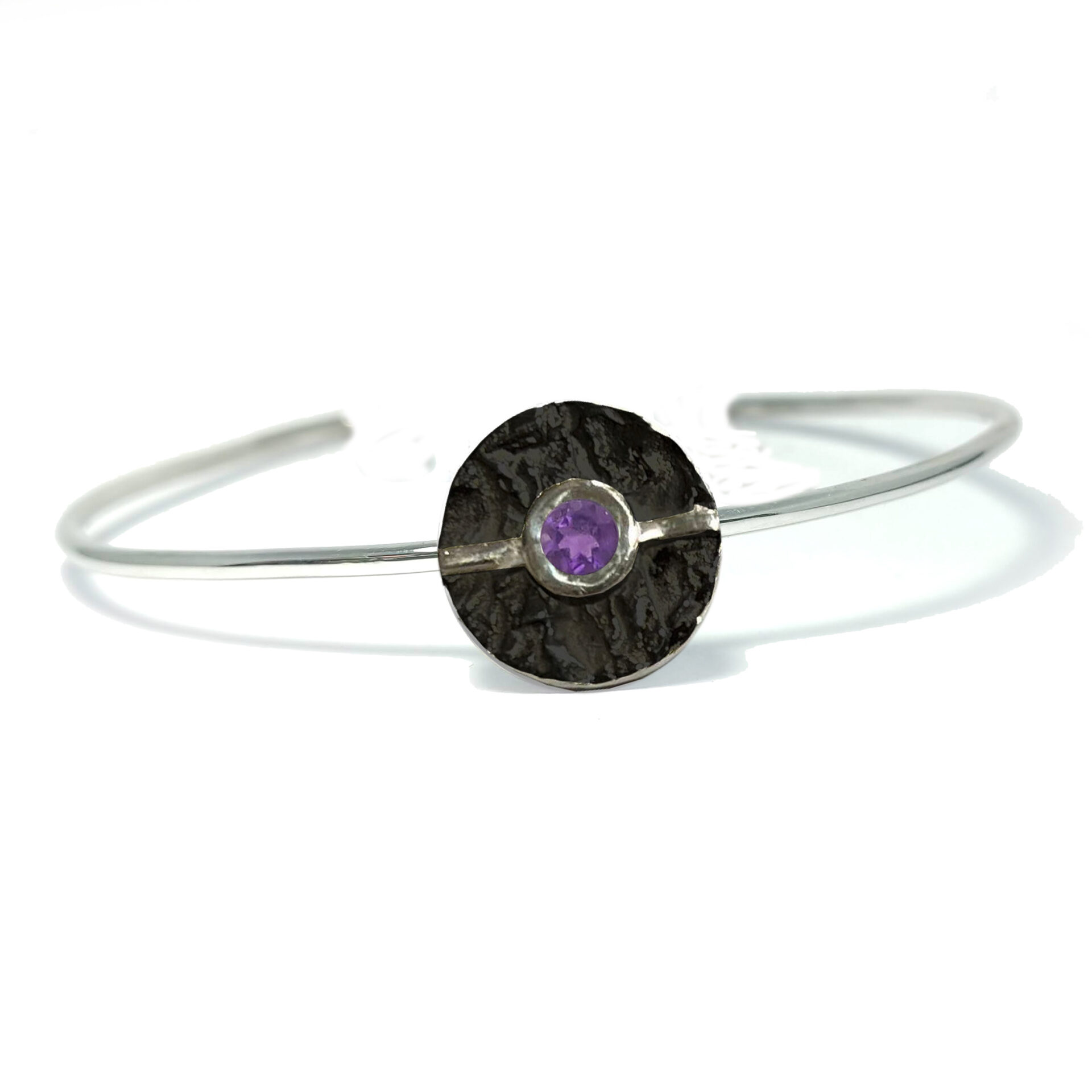 Polsera esclava de la col.lecció Galaxia , rodona d’uns 1.8 cm. de diametre amb textura de plecs de plata i fil cuadrat de plata brillant, amb boca per pedra de 4mm. sobre aro format per fil rodó d’uns 0.2cm de gruix, diametre interior 6cm.