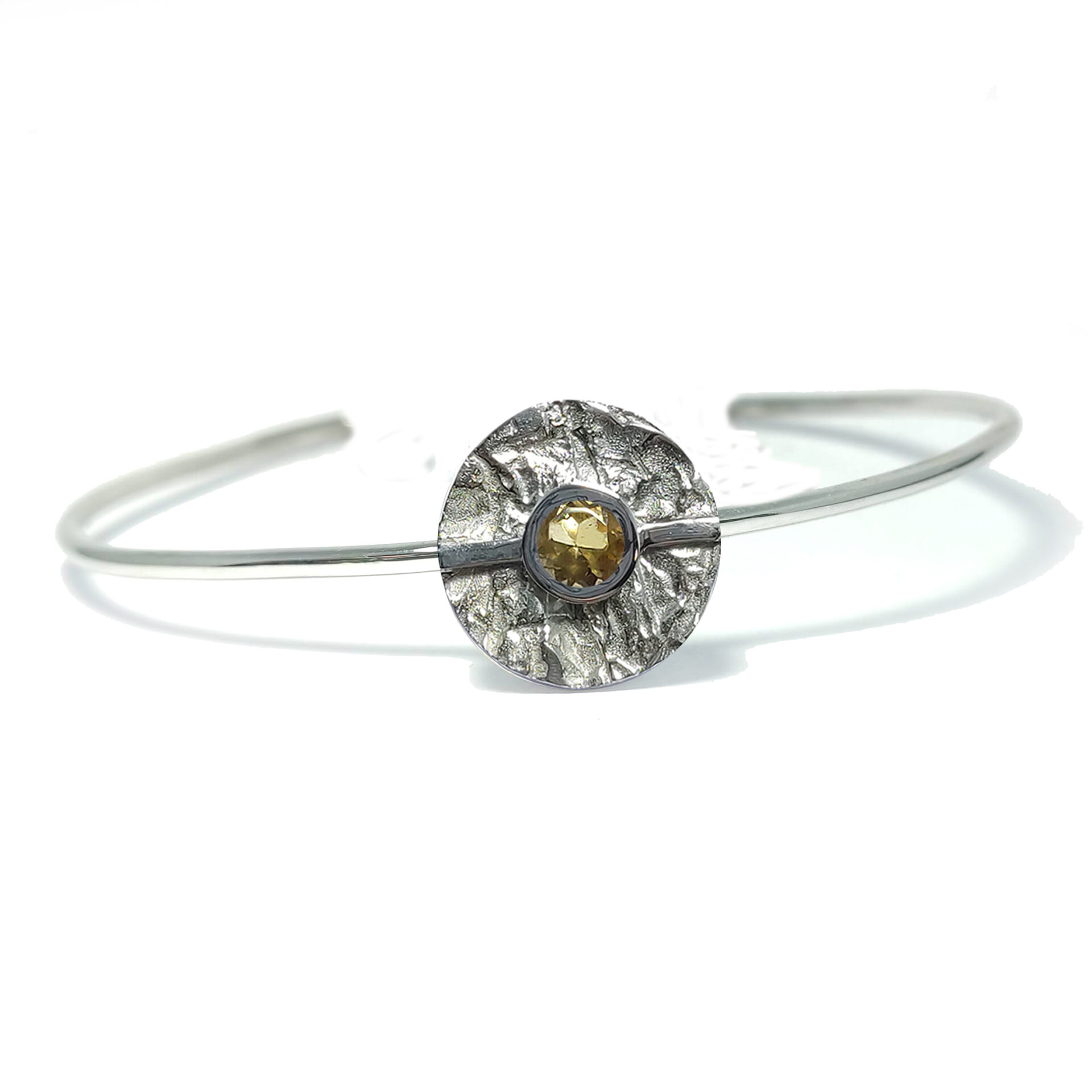 Polsera esclava de la col.lecció Galaxia , rodona d’uns 1.8 cm. de diametre amb textura de plecs de plata i fil cuadrat de plata brillant, amb boca per pedra de 4mm. sobre aro format per fil rodó d’u