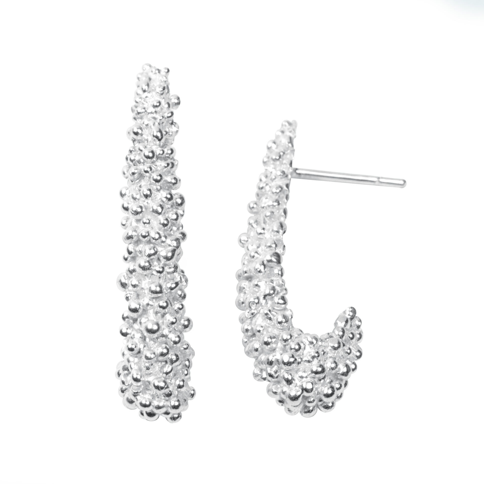 Arracades de la col.lecció Grana , en forma com de llagrima d’uns 3.5 cm. de llargada amb textura plena de boletes petites de plata ennegrida o blanca. Tanca pressió de plata.