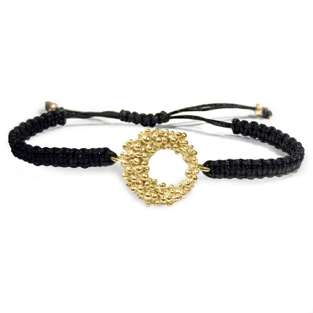 Polsera de la col.lecció Grana , donut d’uns 1.5 cm. de diametre amb forat descentrat i amb textura plena de boletes petites de plata ennegrida o blanca. Cordó macramé negra, amb tanca ajustable.