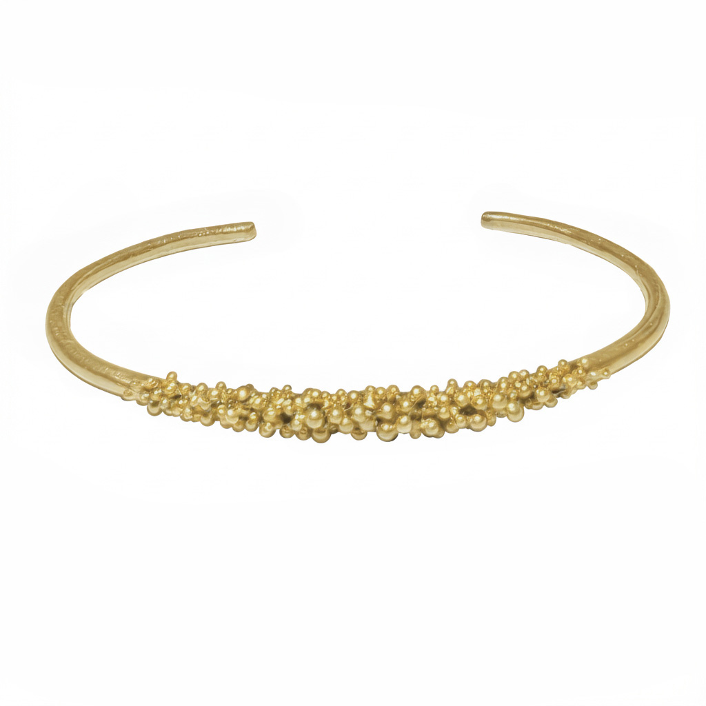 Polsera de la col.lecció Grana , estil esclava, de fil de plata d’uns 0.2cm de diametre, cobert per petites boletes de plata la majoria concentrades en la part central, d’uns 2.2cm de llargada.
