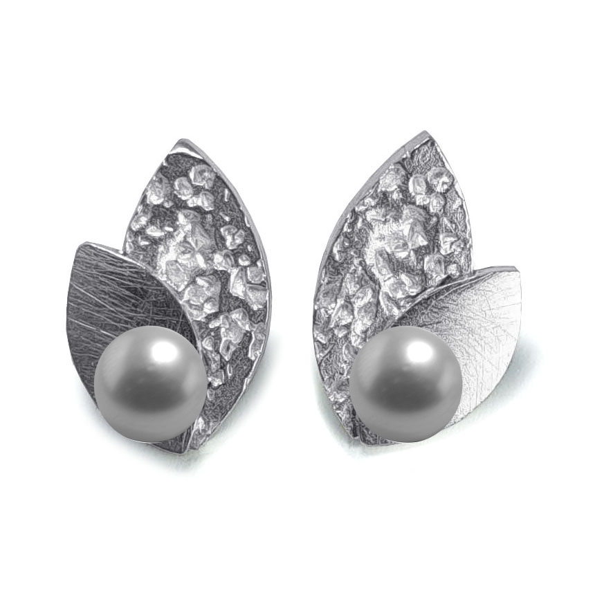 Arracades de la col.lecció LOTO, format per fulla de plata rugosa d’uns 1.7×0.9cm. i fulla de plata lliça d’uns 1.3×0.7cm. amb o sense perla de 6mm. Tanca pressió de plata.