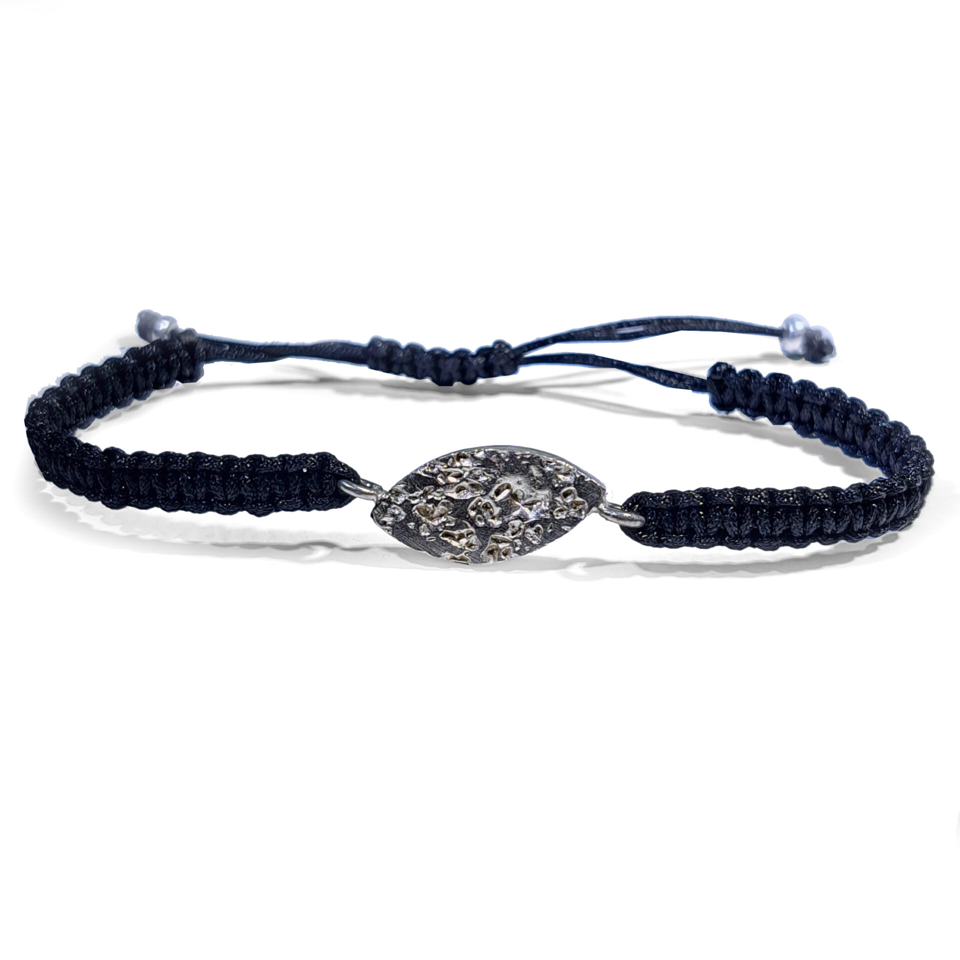 Polsera de la col.lecció LOTO, format per fulla de plata amb part de la superficie grabada, d’uns 1.7×0.9cm. Cordó macramé.