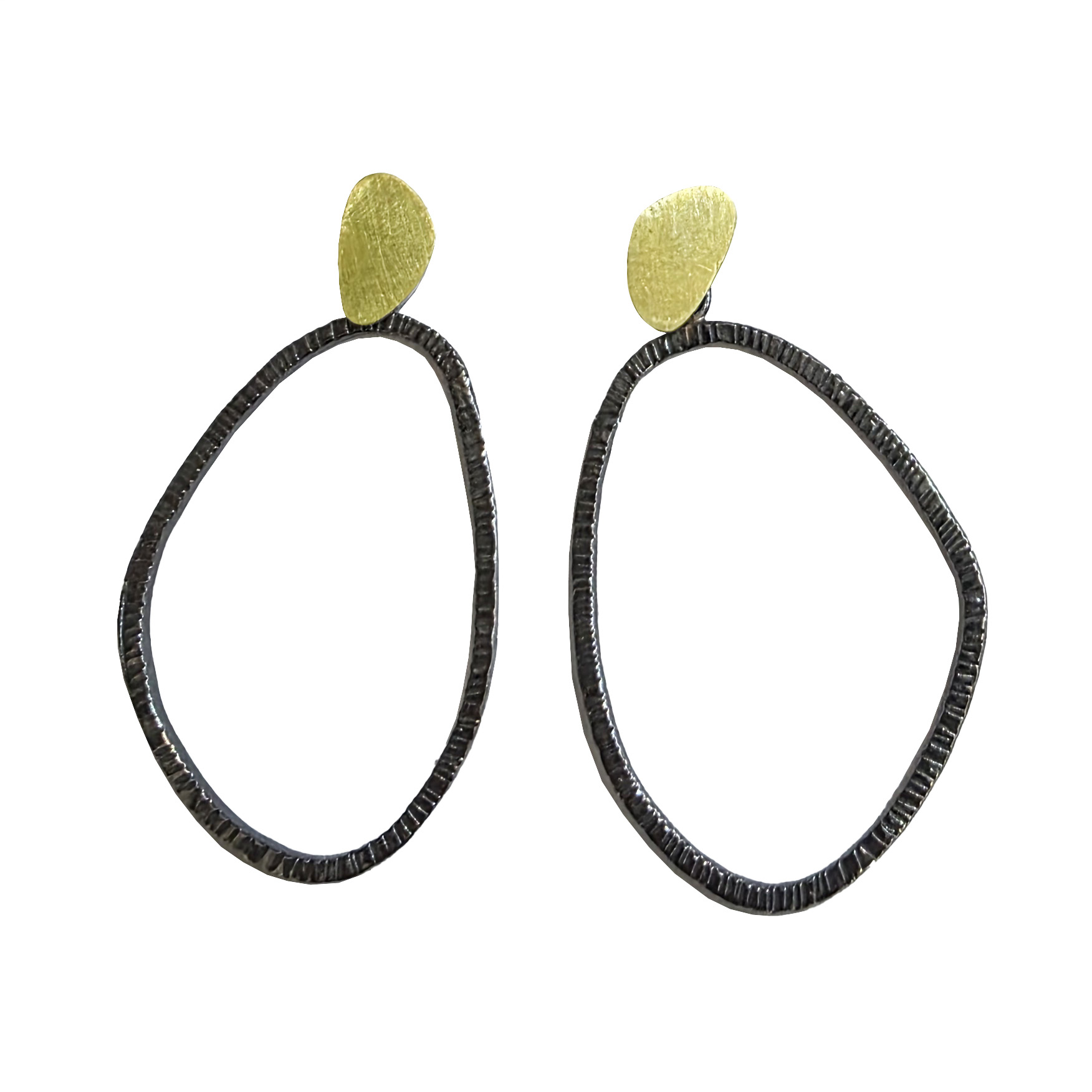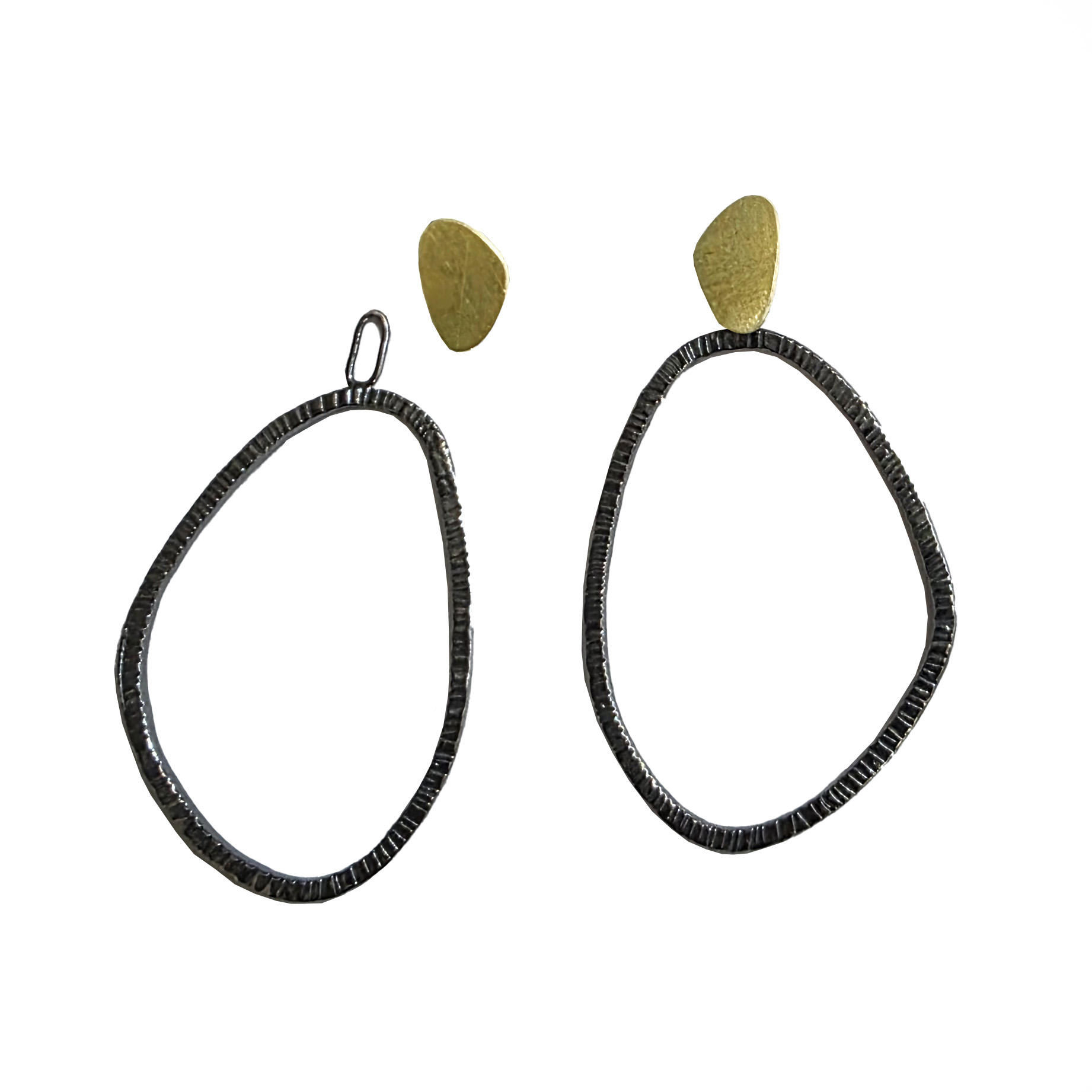 Arracada de la col.lecció OZ, formada per peça ovalada irregular de plata amb lamina d’or de 18 kilats d’uns 1.1×0.7cmi peça ovalada irregular de fil plà de plata ennegrida amb textura de ratlles, d’u