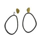 Arracada de la col.lecció OZ, formada per peça ovalada irregular de plata amb lamina d’or de 18 kilats d’uns 1.1×0.7cmi peça ovalada irregular de fil plà de plata ennegrida amb textura de ratlles, d’uns 4×2.6cm de diametre. Tanca pressió de plata.