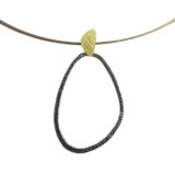 Arracada de la col.lecció OZ, formada per peça ovalada irregular de plata amb lamina d’or de 18 kilats d’uns 1.1×0.7cmi peça ovalada irregular de fil plà de plata ennegrida amb textura de ratlles, d’uns 4×2.6cm de diametre. Corcó no inclós.