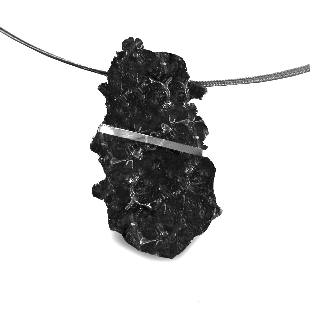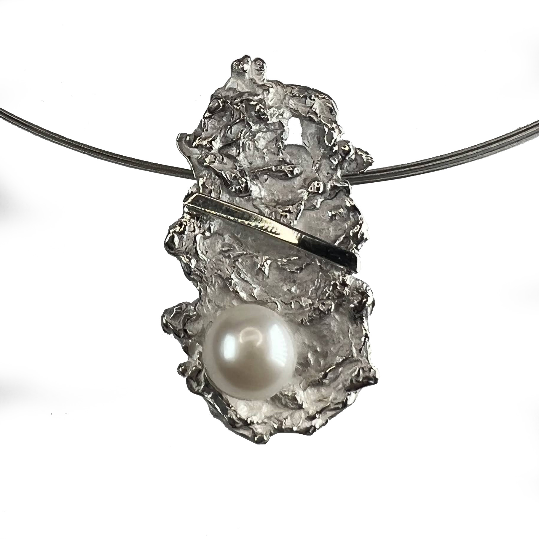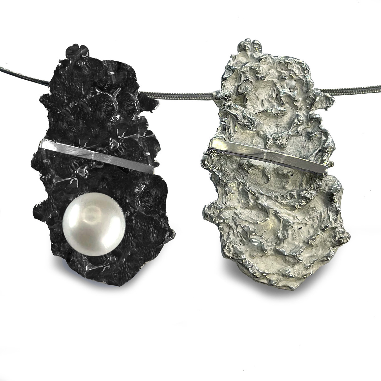 Penjoll de plata, d’uns 5 cm. d’alçada, en forma de textura refossa, en plata blanca o ennegrida i parts brillants, i tira de plata brillant inclinada, amb perla o sense. Cordó no inclós.